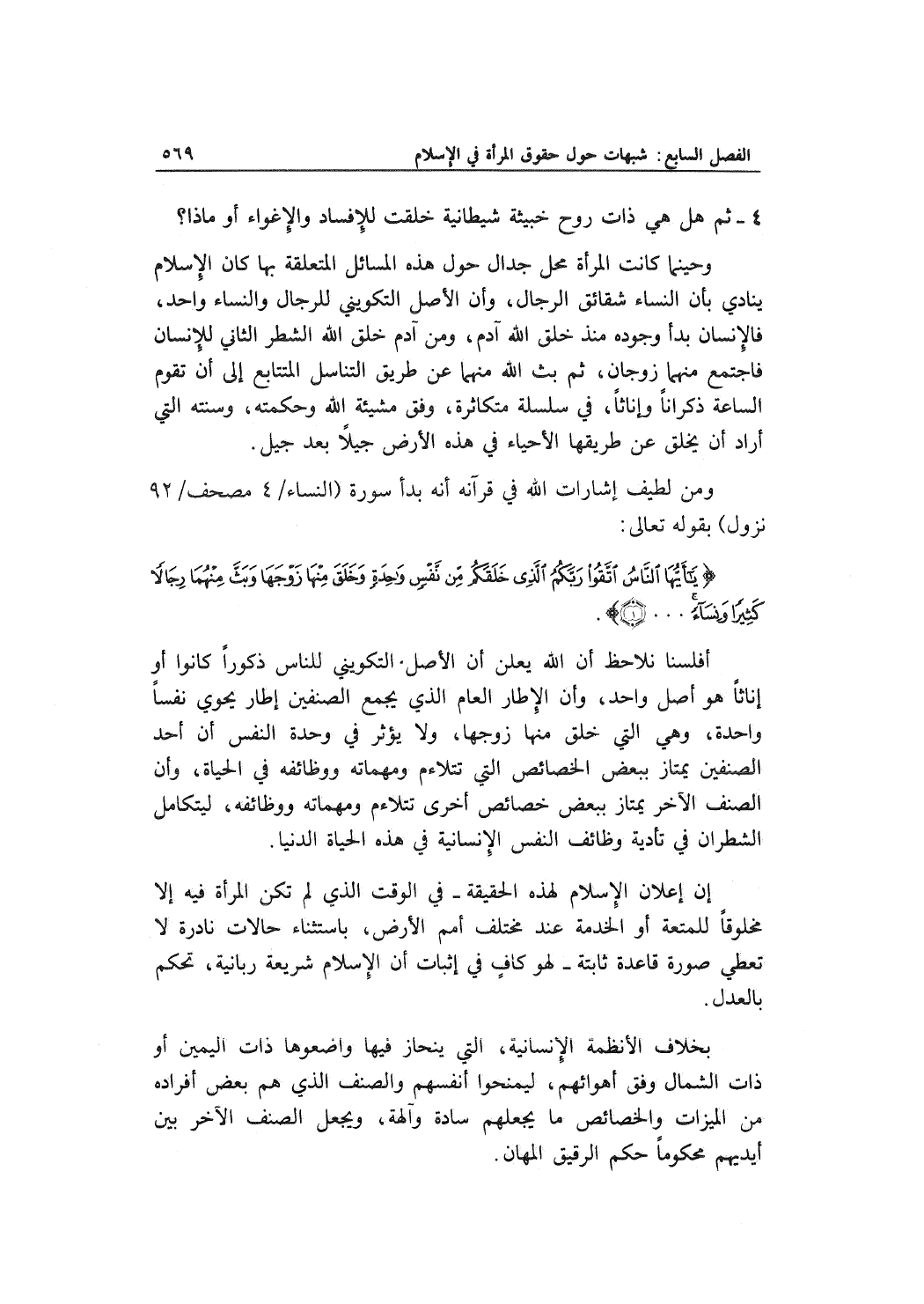 أفلسنا نلاحظ أن الله يعلن أن الأصل التكويني للناس ذكوراً كانوا أو إناثاً هو أصل واحدة، وهي التي خلق منها زوجها، ولا يؤثر في وحدة النفس أن أحد الصنفين يمتاز ببعض الخصائص التي تتلاءم ومهماته ووظائفه في الحياة، وأن الصنف الآخر يمتاز ببعض خصائص أخرى تتلاءم ومهماته ووظائفه، ليتكامل الشطران في تأدية وظائف النفس الإنسانية في هذه الحياة الدنيا.