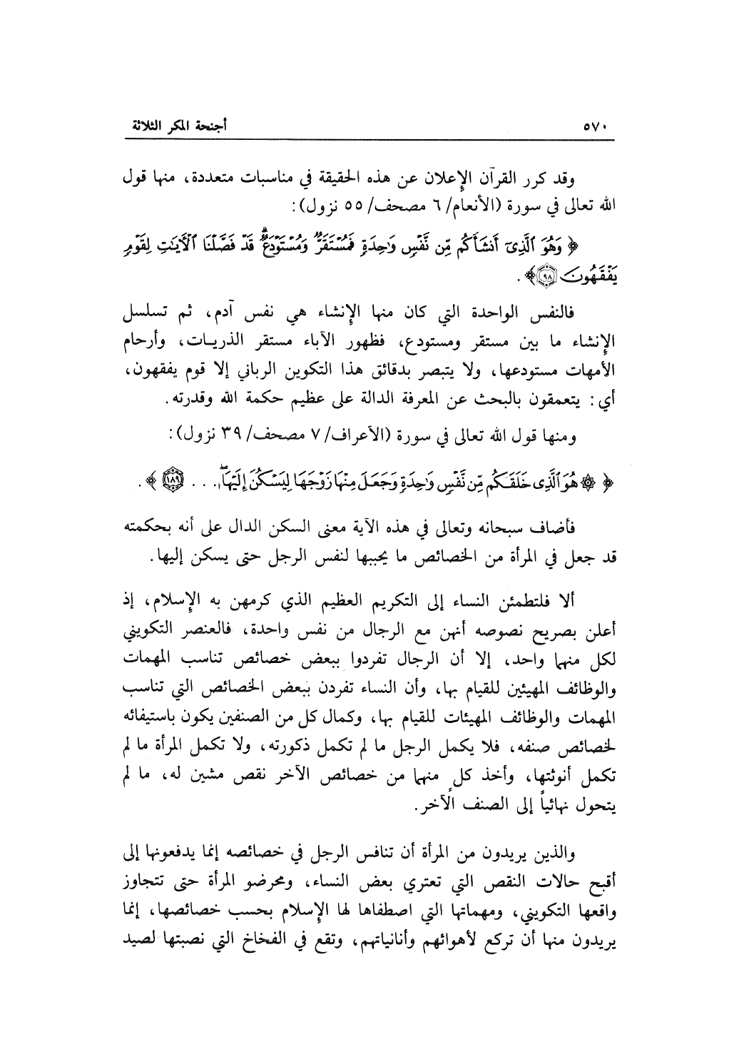 ألا فلتطمئن النساء إلى التكريم العظيم الذي كرمهن به الإسلام، إذ أعلن بصريح نصوصه أنهن مع الرجال من نفس واحدة، فالعنصر التكويني لكل منهما واحد، إلا أن الرجال تفردوا ببعض خصائص تناسب المهمات والوظائف المهيئين للقيام بها، وأن النساء تفردن ببعض الخصائص التي تناسب المهمات والوظائف المهيئات للقيام بها، وكمال كل من الصنفين يكون باستيفائه لخصائص صنفه، فلا يكمل الرجل ما لم لم تكمل ذكورته، ولا تكمل المرأة ما لم تكمل أنوثتها، وأخذ كل منهما من خصائص الآخر نقص مشين له، ما لم يتحول نهائياً إلى الصنف الآخر.