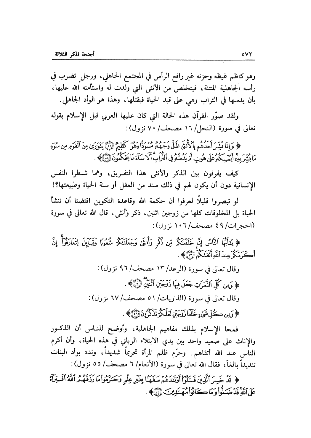 فمحا الإسلام بذلك مفاهيم الجاهلية، وأوضح للناس أن الذكور والإناث على صعيد واحد بين يدي الابتلاء الرباني في هذه الحياة، وأ، أكرم الناس عند الله أتقاهم. وحرّم ظلم المرأة تحريماً شديداً، وندد بوأد البنات تنديداً بالغاً، فقال الله تعالى في سورة (الأنعام/6 مصحف/55 نزول) :