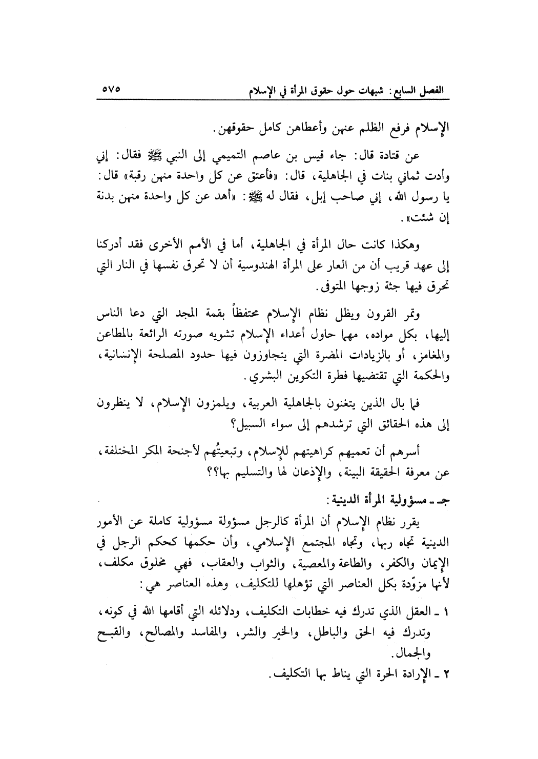 يقرر نظام الإسلام أن المرأة كالرجل مسؤولة مسؤولية كاملة عن الأمور الدينية تجاه ربها، وتجاه المجتمع الإسلامي، وأن حكمها حكم الرجل في الإيمان والكفر، والطاعة والمعصية، والثواب والعقاب، فهي مخلوق مكلف، لأنها مزوّدة بكل العناصر التي تؤهلها للتكليف، وهذه العناصر هي: