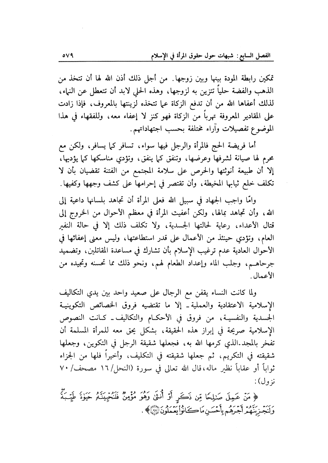 ولما كانت النساء يقفن مع الرجال على صعيد واحد بين يدي التكاليف الإسلامية الاعتقادية والعملية - إلا ما تقتضيه فروق الخصائص التكوينية الجسدية والنفسية، من فروق في الأحكام والتكاليف - كانت النصوص الإسلامية صريحة في إبراز هذه الحقيقة، بشكل يحق معه للمرأة املسلمة أن تفخر بالمجد الذي كرمها الله به، فجعلها شقيقة الرجل في التكوين، وجعلها شقيقته في التكريم، ثم جعلها شقيقته في التكليف، وأخيراً فلها من الجزاء ثواباً أو عقاباً نظير ماله، قال الله تعالى في سورة (النحل/16 مصحف/70 نزول) :