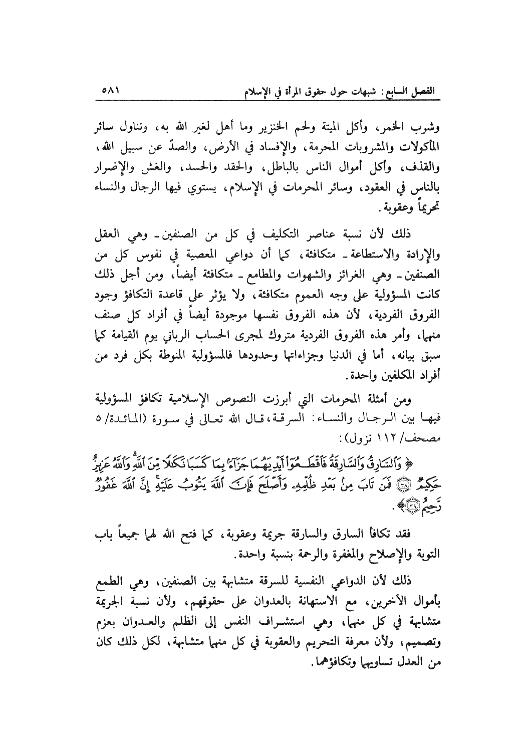 ومن أمثلة المرحمات التي أبرزت النصوص الإسلامية تكافؤ المسؤولية فيها بين الرجال والنساء: السرقة، قال الله تعالى في سورة (المائدة/5 مصحف/112 نزول) :