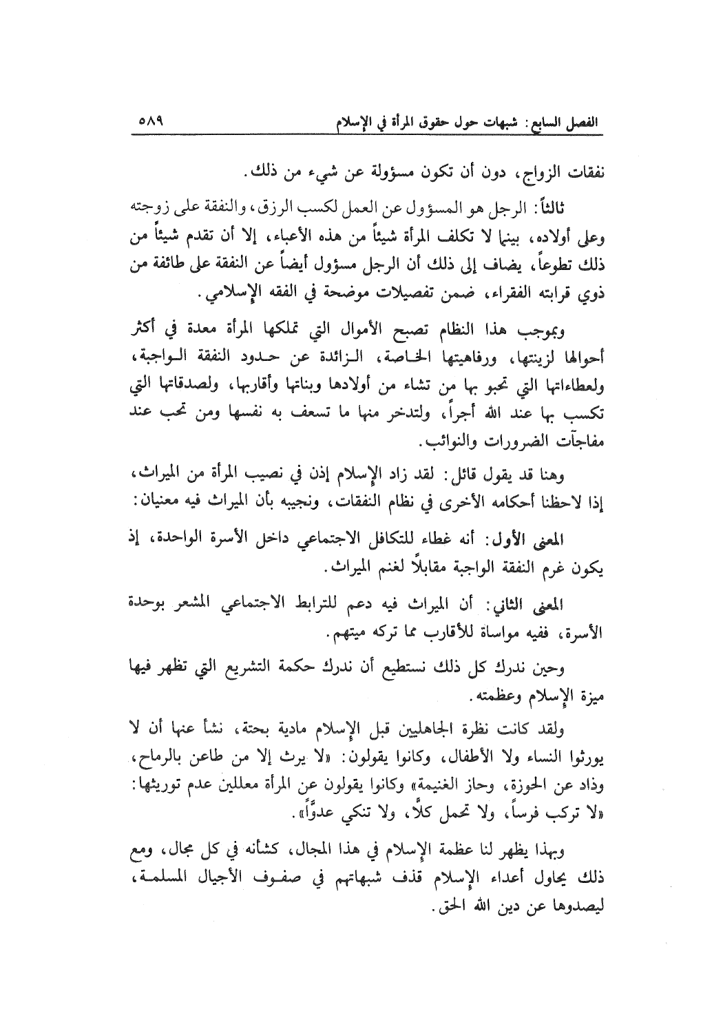وهنا قد يقول قائل: لقد زاد الإسلام إذن في نصيب المرأة من الميراث، إذا لاحظنا أحكامه الأخرى في نظام النفقات، ونجيبه بأن الميراث فيه معنيان: