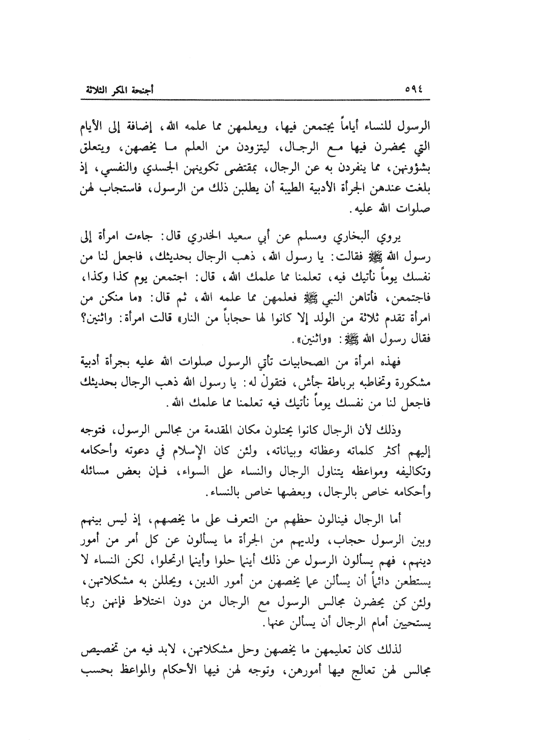 لذلك كان تعليمهن ما يخصهن وحل مشكلاتهن، لا بد فيه من تخصيص مجالس لهن تعالج فيها أمورهن، وتوجه لهن فيها الأحكام والمواعظ بحسب