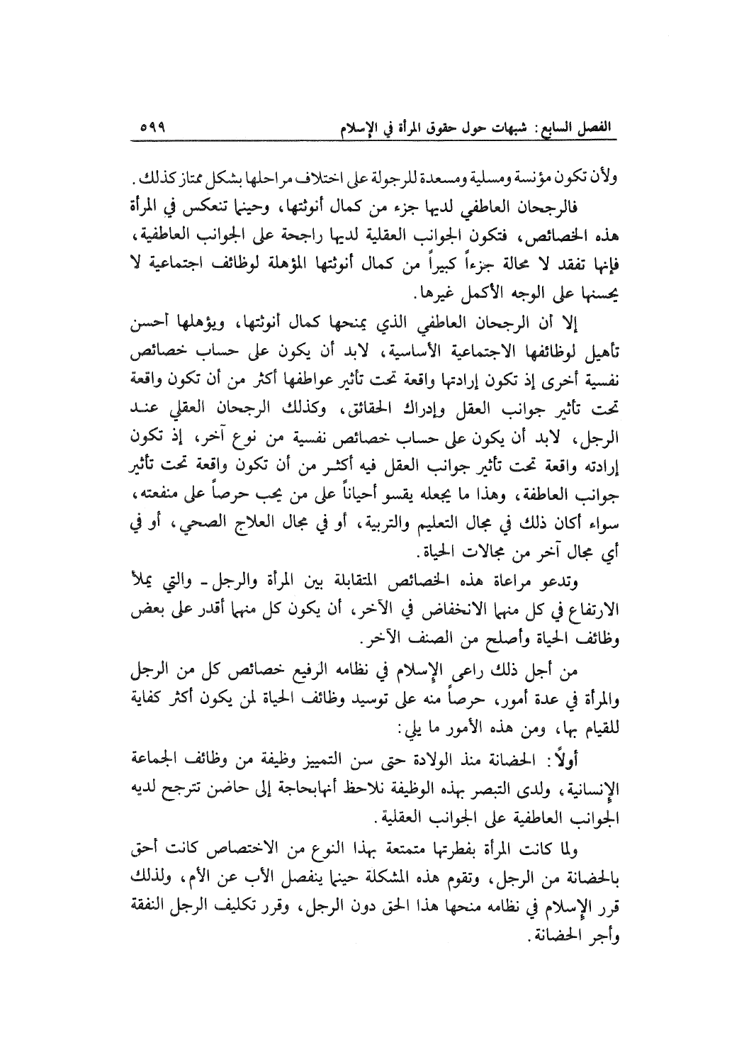 فالرجحان العاطفي لديها جزء من كمال أنوثتها، وحينما تنعكس في المرأة هذه الخصائص، فتكون الجوانب العقلية لديها راجحة على الجوانب العاطفية، فإنها تفقد لا محالة جزءاً كبيراً من كمال أنوثتها المؤهلة لوظائف اجتماعية لا يحسنها على الوجه الأكمل غيرها.