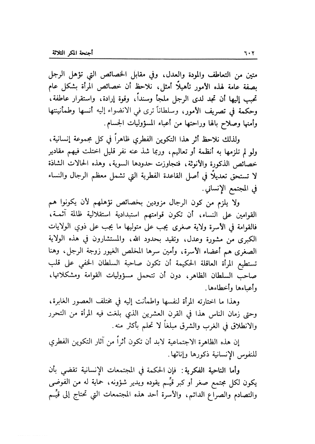 ولذلك نلاحظ أثر هذا التكوين الفطري ظاهراً في كل مجموعة إنسانية، ولو لم تلزمها به أنظمة أو تعاليم، وربما شذ عنه نفر قليل اختلت فيهم مقادير خصائص الذكورة والأنوثة، فتجاوزت حدودها السوية، وهذه الحالات الشاذة لا تسحق تعديلاً في أصل القاعدة الفطرية التي تشمل معظم الرجال والنساء في المجتمع الإنساني.