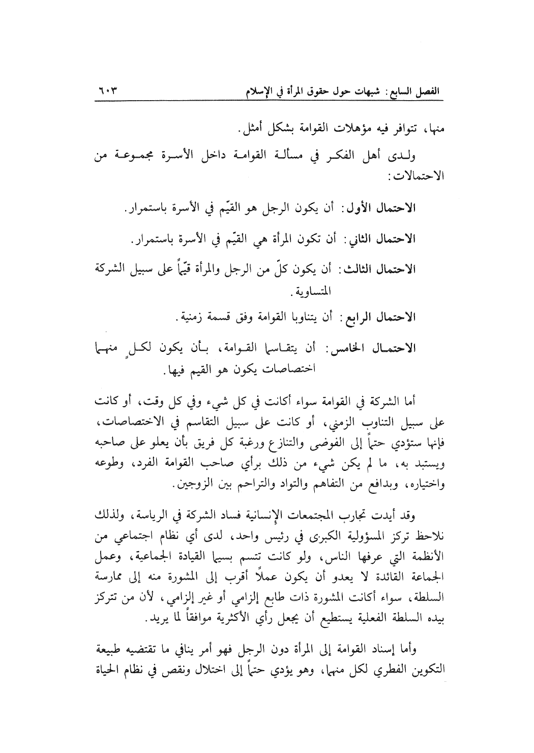 ولدى أهل الفكر في مسألة القوامة داخل الأسرة مجموعة من الاحتمالات: