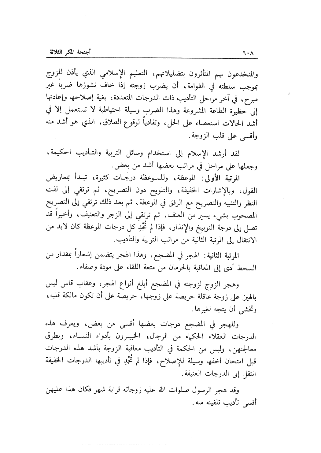 وللهجر في المضجع درجات بعضها أقسى من بعض، ويعرف هذه الدرجات العقلاء الحكماء من الرجال، الخبيرون بأدواء النساء، وبطرق معالجتهن، وليس من الحكمة في التأديب معاقبة الزوجة بأشد هذه الدرجات قبل امتحان أخفها وسيلة للإصلاح، فإذا لم تُجْدِ في تأديبها الدرجات الخفيفة انتقل إلى الدرجات العنيفة.