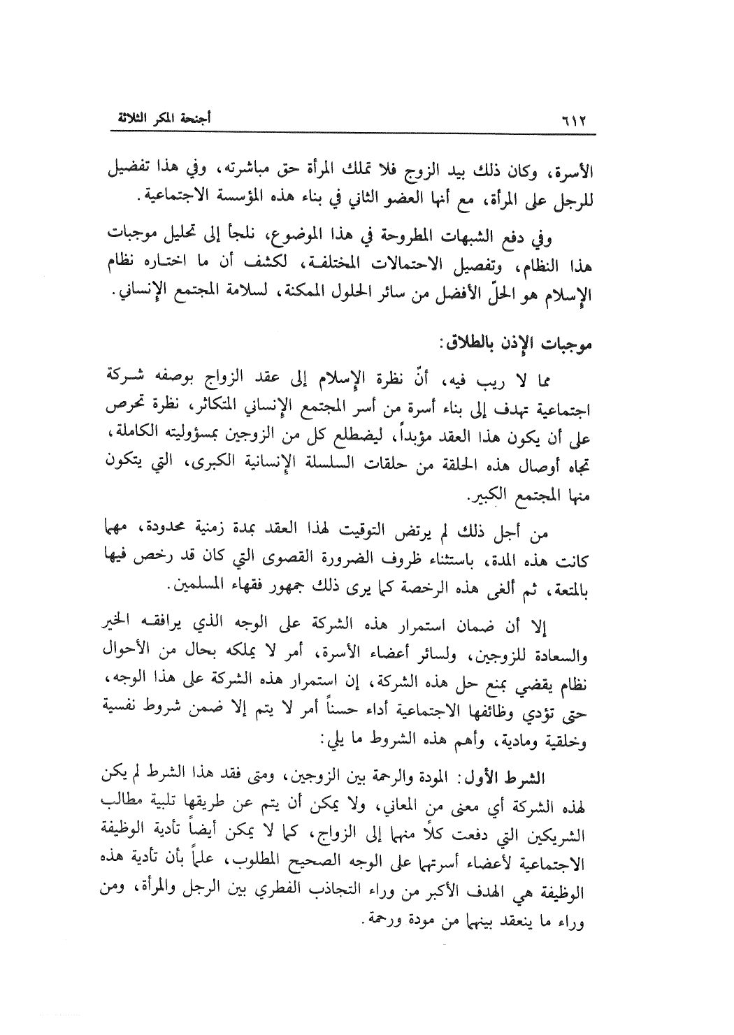 إلا أن ضمان استمرار هذه الشركة على الوجه الذي يرافقه الخير والسعادة للزوجين، ولسائر أعضاء الأسرة، أمر لا يملكه بحال من الأحوال نظام يقضي بمنع حل هذه الشركة، إن استمرار هذه الشركة على هذا الوجه، حتى تؤدي وظائفها الاجتماعية أداء حسناً أمر لا يتم إلا ضمن شروط نفسية وخلقية ومادية، وأهم هذه الشروط ما يلي: