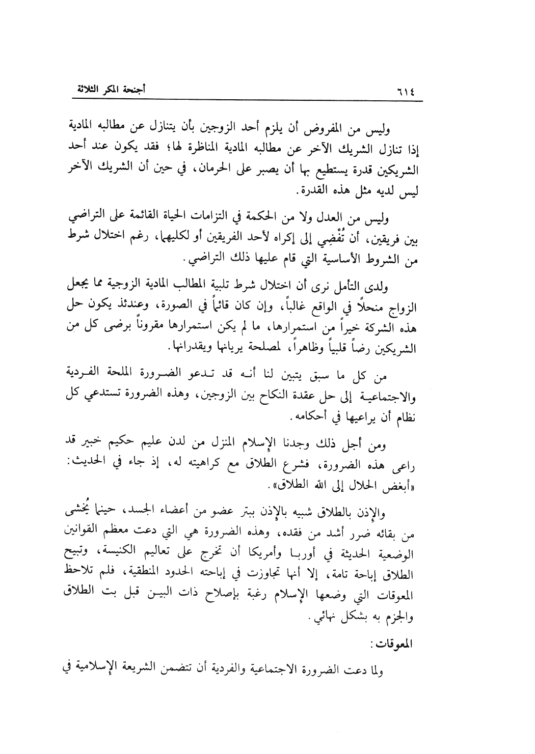 وليس من العدل ولا من الحكمة في التزامات الحياة القائمة على التراضي بين فريقين، أن تُفْضِي إلى إكراه لأحد الفريقي أو لكليهما، رغم اختلال شرط من الشروط الأساسية التي قام عليها ذلك التراضي.