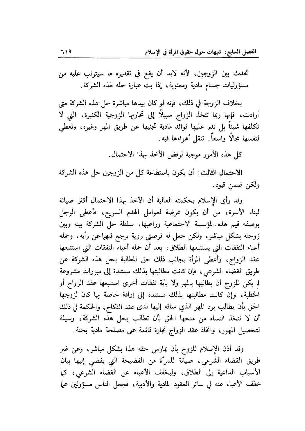 وقد رأى الإسلام بحكمته العالية أن الأخذ بهذا الاحتمال أكثر صيانة لبناء الأسرة، من أن يكون عرضة لعوامل الهدم السريع، فأعطى الرجل بوصفه قيم هذه المؤسسة الاجتماعية وراعيها، سلطة حل الشركة بينه وبين زوجته بشكل مباشر، ولكن جعل له فرصتي روية يرجع فيهما عن رأيه، وحمله أعباء النفقات التي يستتبعها الطلاق، بعد أن حمله أعباء النفقات التي استتبعها عقد الزواج، وأعطى المرأة بجانب ذلك حق المطالبة بحل هذه الشركة عن طريق القضاء الشرعي، فإن كانت مطالبتها بذلك مستندة إلى مبررات مشروعة لم يكن للزوج أن يطالبهاب المهر ولا بأية نفقات أخرى استتبعها عقد الزواج أو الخطبة، وإن كانت مطالبتها بذلك مستندة إلى إرادة خاصة بها كان لزوجها الحق بأن يطالب برد المهر الذي ساقه إليها لدى عقد النكاح، والحكمة في ذلك أن لا تتخذ النساء من منحها الحق بأن تطالب بحل هذه الشركة، وسيلة لتحصيل المهور، واتخاذ عقد الزواج تجارة قائمة على مصلحة مادية بحتة.