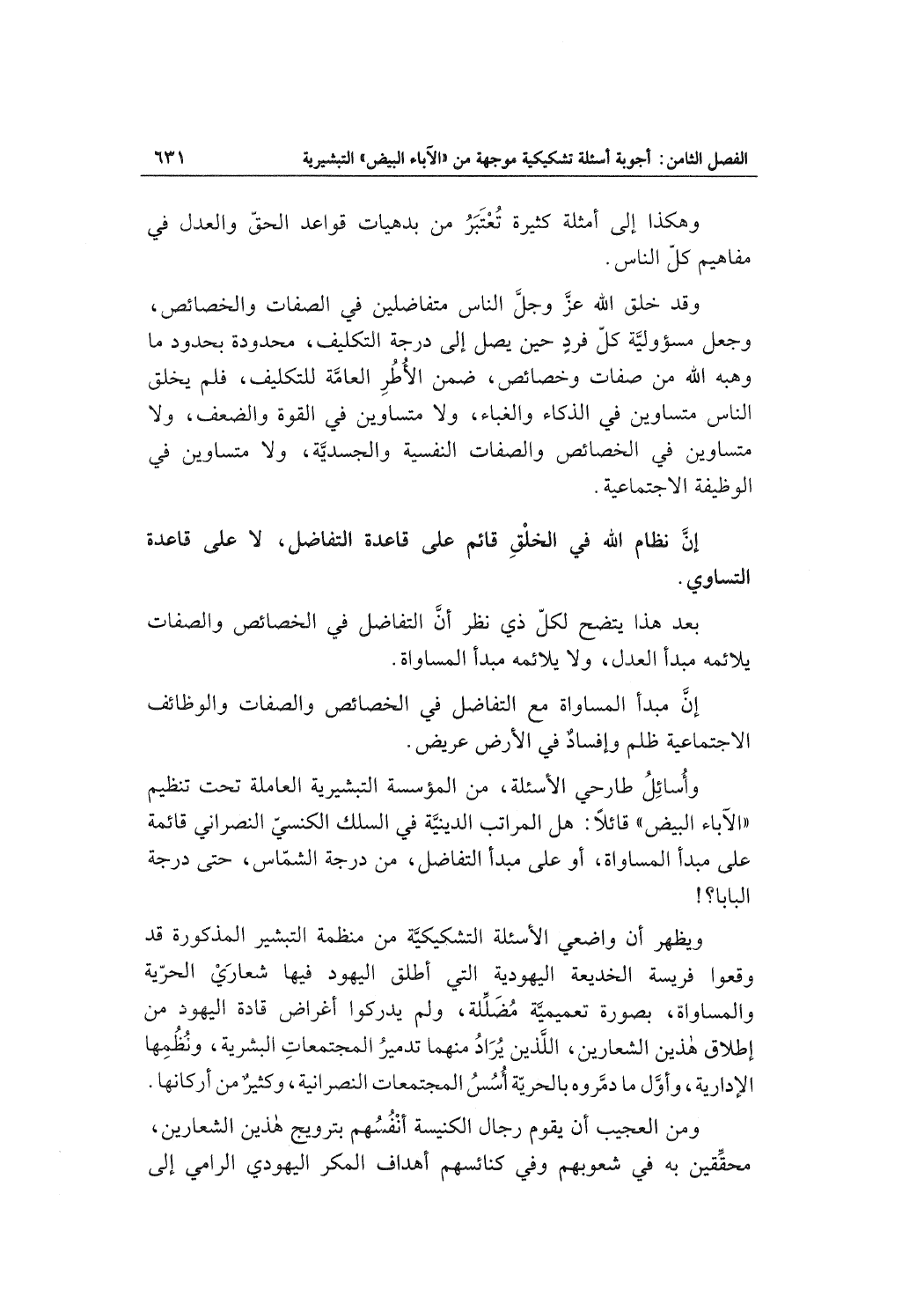 وأُسائِلُ طارحي الأسئلة، من المؤسسة التبشيرية العاملة تحت تنظيم "الآباء البيض" قائلاً: هل المراتب الدينيَّة في السلك الكنسيّ النصراني قائمة على مبدأ المساواة، أو على مبدأ التفاضل، من درجة الشمّاس، حتى درجة البابا؟!