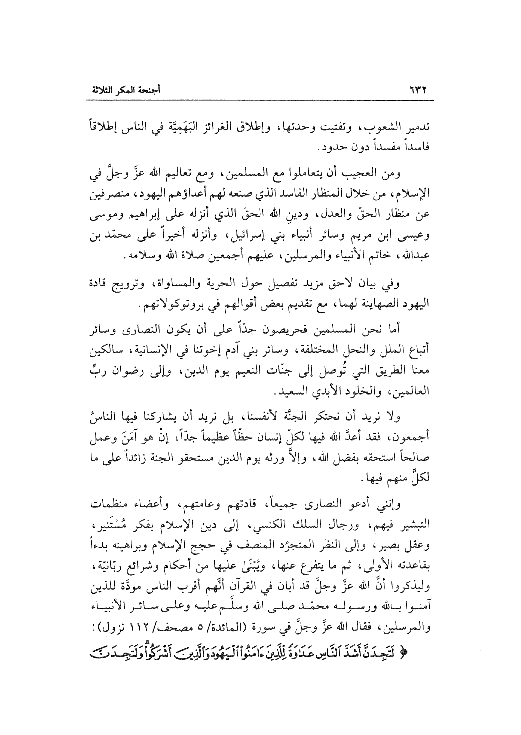 وإنني أدعو النصارى جميعاً، قادتهم وعامتهم، وأعضاء منظمات التبشير فيهم، ورجال السلك الكنسي، إلى دين الإسلام بفكر مُسْتَنير، وعقل بصير، وإلى النظر المتجرِّد المنصف في حجج الإسلام وبراهينه بدءاً بقاعدته الأولى، ثم ما يتفرع عنها، ويُبْنَى عليها من أحكام وشرائع ربّانيّة، وليذكروا أنّ الله عزَّ وجلَّ قد أبان في القرآن أنَّهم أقرب الناس مودَّة للذين آمنوا بالله ورسوله محمّد صلى الله عليه وعلى سائر الأنبياء والمرسلين، فقال الله عز وجل في سورة (المائدة/5 مصحف/112 نزول) :