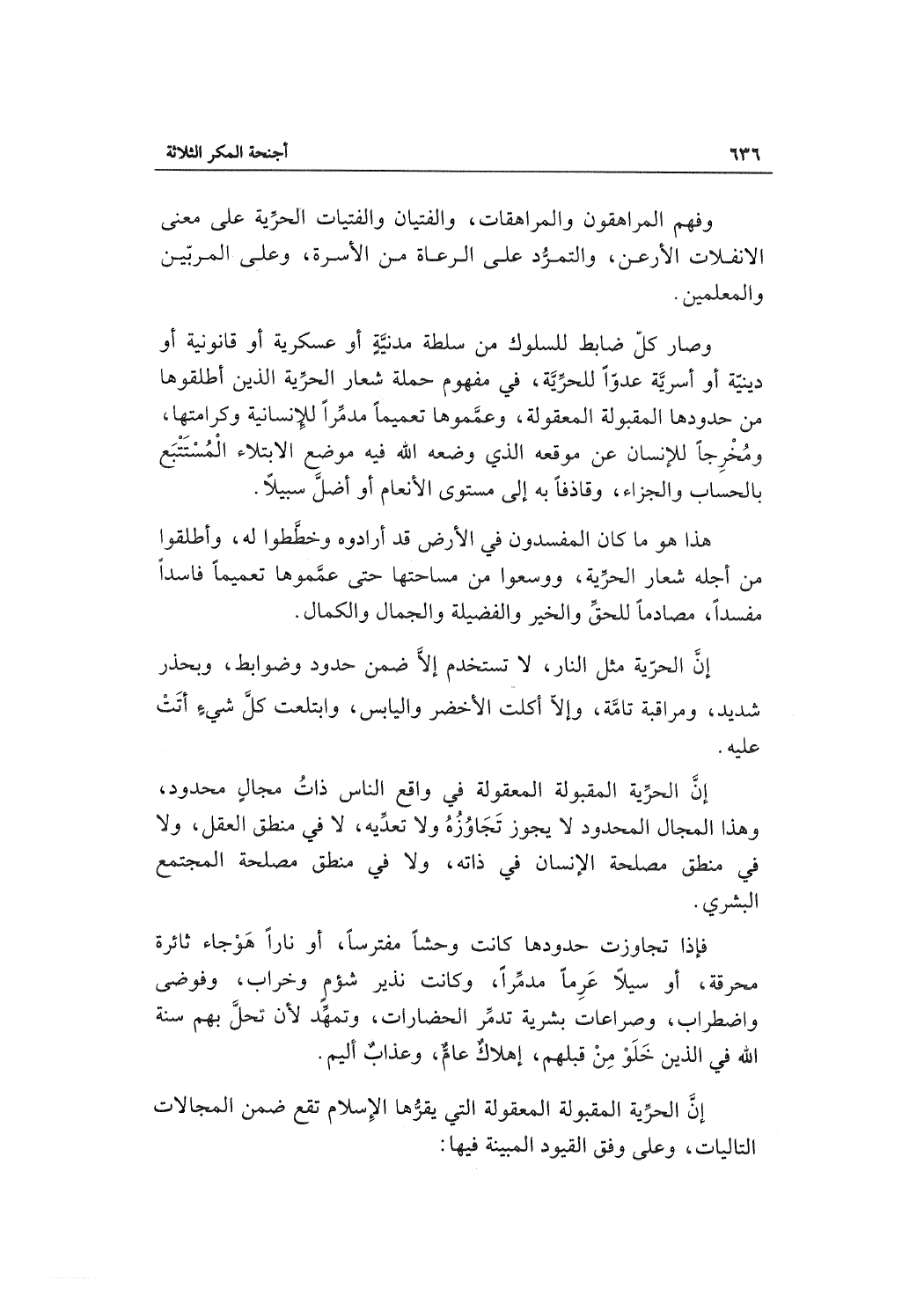 إنَّ الحرِّية المقبولة المعقولة في واقع الناس ذاتُ مجالٍ محدود، وهذا المجال المحدود لا يجوز تَجَاوُزُهُ ولا تعدِّيه، لا في منطق العقل، ولا في منطق مصلحة الإنسان في ذاته، ولا في منطق مصلحة المجتمع البشري.
