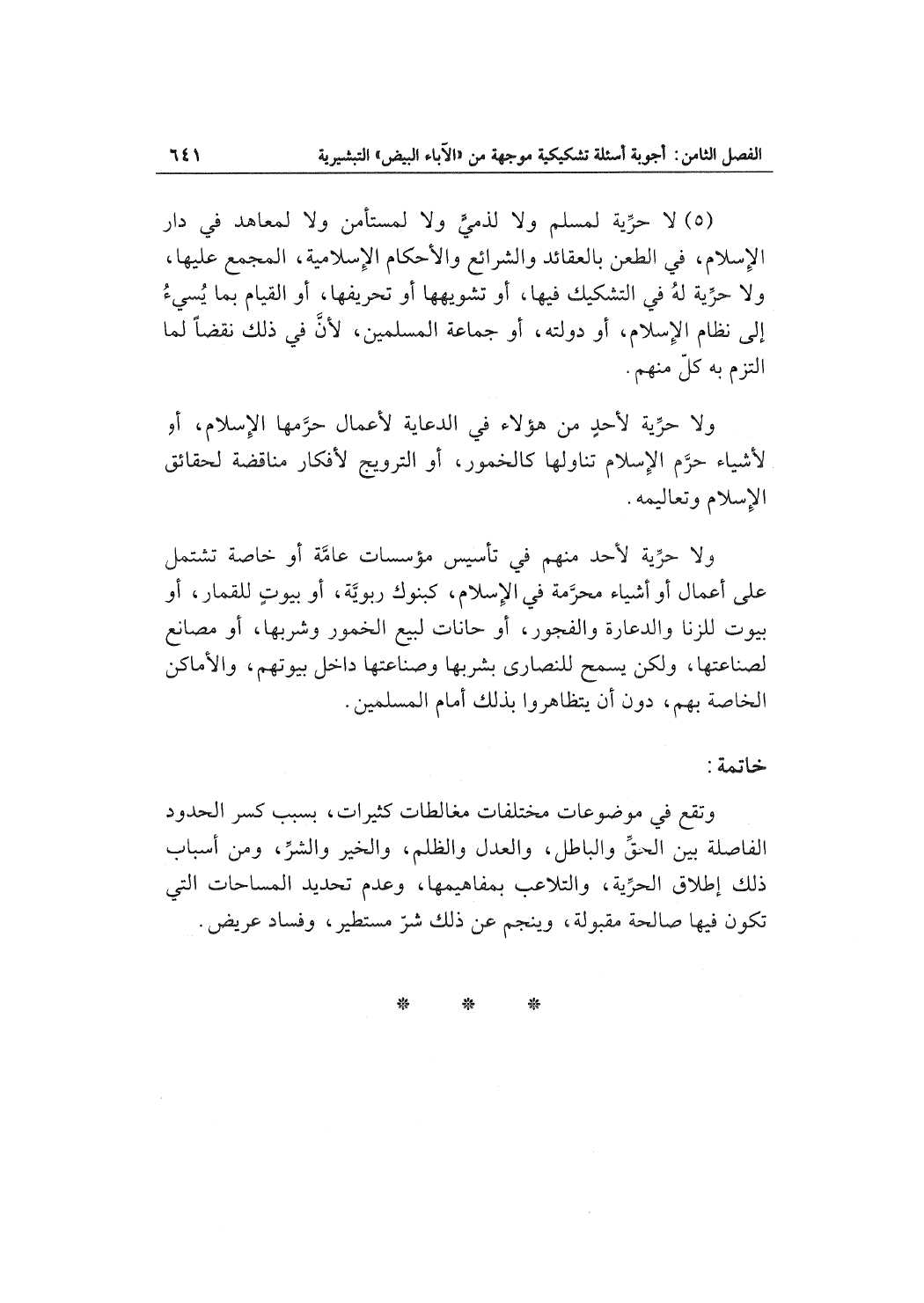 (5) لا حرِّية لمسلم ولا لذميٍّ ولا لمستأمن ولا لمعاهد في دار الإسلام، في الطعن بالعقائد والشرائع والأحكام الإسلامية، المجمع عليها، ولا حرِّيَّة له في التشكيك فيها، أو تشويهها أو تحريفها، أو القيام بما يُسيءُ إلى نظام الإسلام، أو دولته، أو جماعة المسلمين، لأنَّ في ذلك نقضاً لما التزم به كلّ منهم.