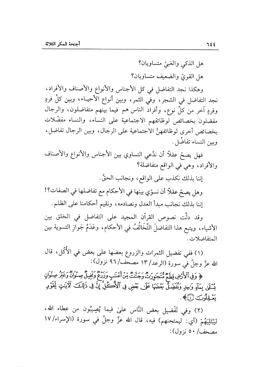 وقد دلَّت نصوص القرآن المجيد على التفاضل في الخلق بين الأشياء، ويتبع هذا التفاضلَ التَّخَالُفُ في الأحكام، وعَدَمُ جَوازِ التسوية بين المتفاضلات.