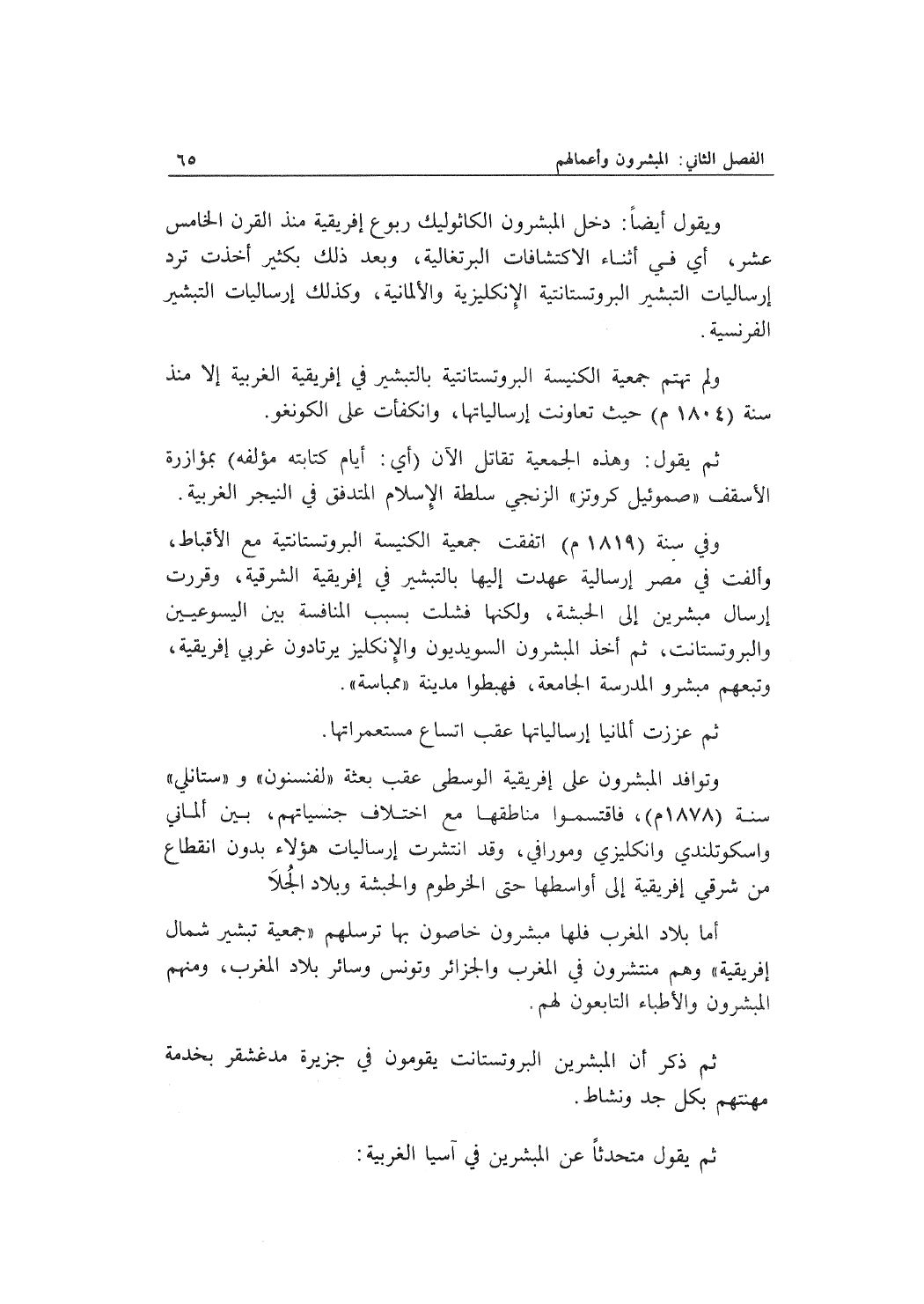 ويقول أيضاً: دخل المبشرون الكاثوليك ربوع إفريقية منذ القرن الخامس عشر، أي في أثناء الاكتشافات البرتغالية، وبعد ذلك بكثير أخذت ترد إرساليات التبشير البروتستانتية الإنكليزية والألمانية، وكذلك إرساليات التبشير الفرنسية.