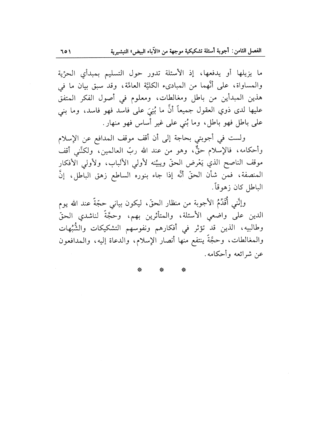 وإنَّني أُقّدِّمُ الأجوبة من منظار الحقّ، ليكون بياني حجّةً عند الله يوم الدين على واضعي الأسئلة، والمتأثرين بهم، وحجَّةً لناشدي الحقّ وطالبيه، الذين قد تؤثر في أفكارهم ونفوسهم التشكيكات والشُّبُهات والمغالطات، وحجَّةً ينتفع منها أنصار الإسلام، والدعاة إليه، والمدافعون عن شرائعه وأحكامه.