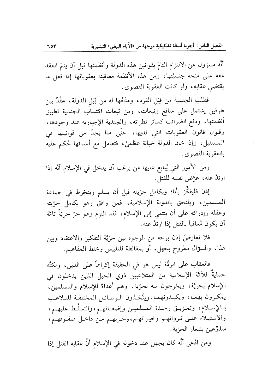 إذن فليفكِّرْ بأناة وبكامل حرّيته قبل أن يسلم وينخرط في جماعة المسلمين، ويلتحق بالدولة الإسلامية، فمن وافق وهو بكامل حرّيته وعقله وإدراكه على أن ينتمي إلى الإسلام، فقد التزم وهو حرّ حريةً تامَّة أن يكون مُعاقباً بالقتل إذا ارتدَّ عنه.