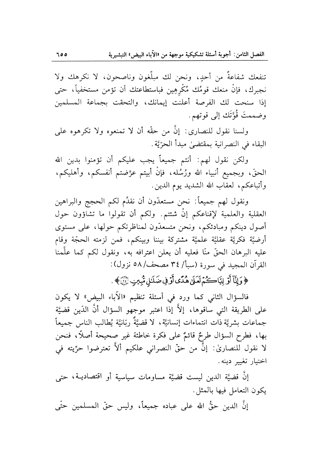 ونقول لهم جميعاً: نحن مستعدّون أن نقدِّم لكم الحجج والبراهين العقلية والعلمية لإقناعكم إنْ شئتم. ولكم أن تقولوا ما تشاؤون حول أصول دينكم ومبادئكم، ونحن مستعدّون لمناظرتكم حولها، على مستوى أرضيَّة فكريَّة عقليَّة علميَّة مشتركة بيننا وبينكم، فمن لزمته الحجّة وقام عليه البرهان الحقّ منّا فعليه أن يعلن اعترافه به، ونقول لكم كما علَّمنا القرآن المجيد في سورة (سبأ/34 مصحف/58 نزول) :
