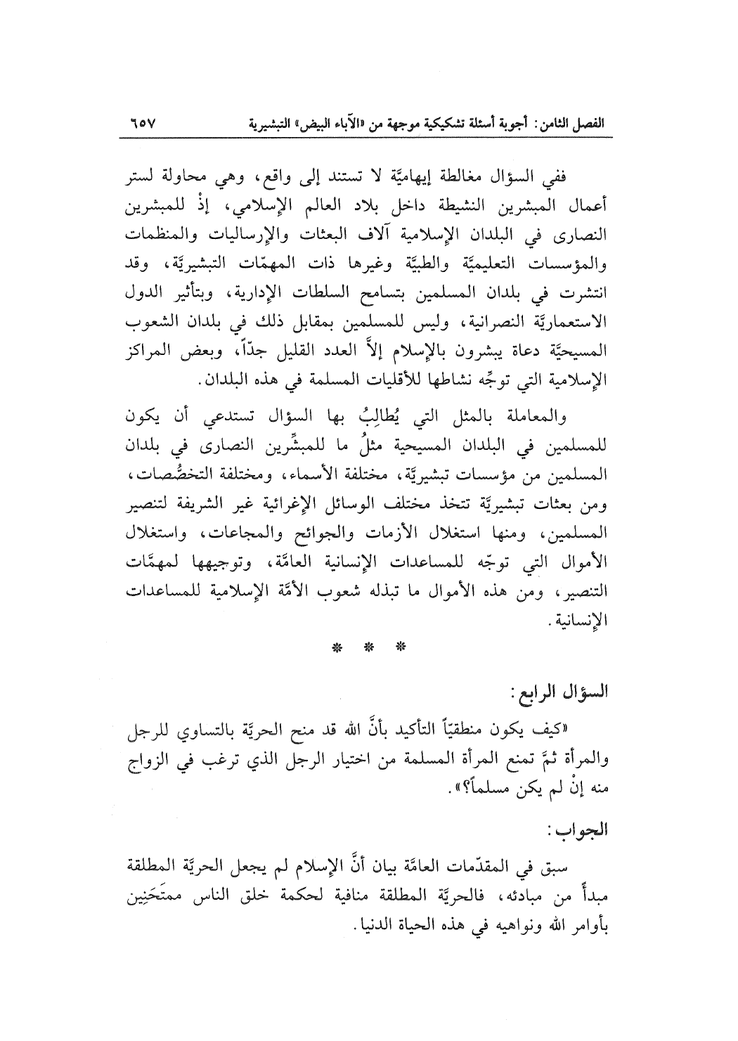 ففي السؤال مغالطة إيهاميَّة لا تستند إلى واقع، وهي محاولة لستر أعمال المبشرين النشيطة داخل بلاد العالم الإسلامي، إذْ للمبشرين النصارى في البلدان الإسلامية آلاف البعثات والإرساليات والمنظمات والمؤسسات التعليميَّة والطبيَّة وغيرها ذات المهمّات التبشيريَّة، وقد انتشرت في بلدان المسلمين بتسامح السلطات الإدارية، وبتأثير الدول الاستعماريَّة النصرانية، وليس للمسلمين بمقابل ذلك في بلدان الشعوب المسيحيَّة دعاة يبشرون بالإسلام إلاَّ العدد القليل جدّاً، وبعض المراكز الإسلامية التي توجِّه نشاطها للأقليات المسلمة في هذه البلدان.