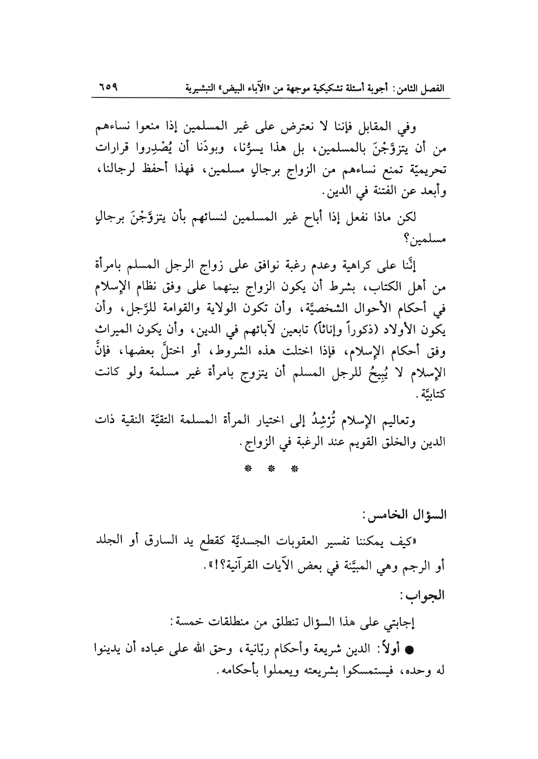إنَّنا على كراهية وعدم رغبة نوافق على زوج الرجل المسلم بامرأة من أهل الكتاب، بشرط أن يكون الزواج بينهما على وفق نظام الإسلام في أحكام الأحوال الشخصيَّة، وأن تكون الولاية والقوامة للرَّجل، وأن يكون الأولاد (ذكوراً وإناثاً) تابعين لآبائهم في الدين، وأن يكون الميراث وفق أحكام الإسلام، فإذا اختلت هذه الشروط، أو اختلَّ بعضها، فإنَّ الإسلام لا يُبِيحُ للرجل المسلم أن يتزوج بامرأة غير مسلمة ولو كانت كتابيَّة.