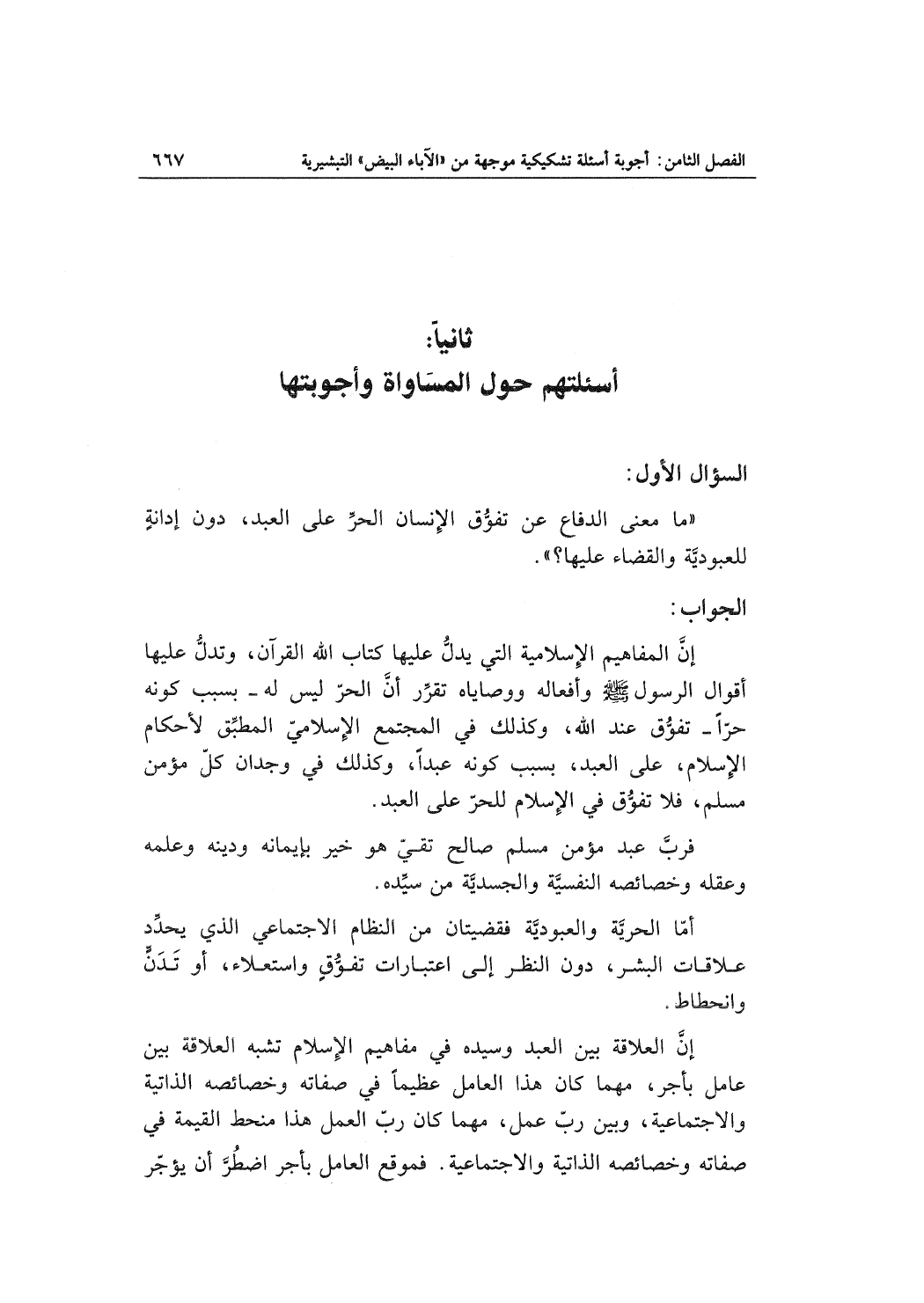 أما الحرِّيَّة والعبودية فقضيتان من النظام الاجتماعي الذي يحدد علاقات البشر، دون النظر إلى اعتبارات تفوق واستعلاء، أو تدن وانحطاط.