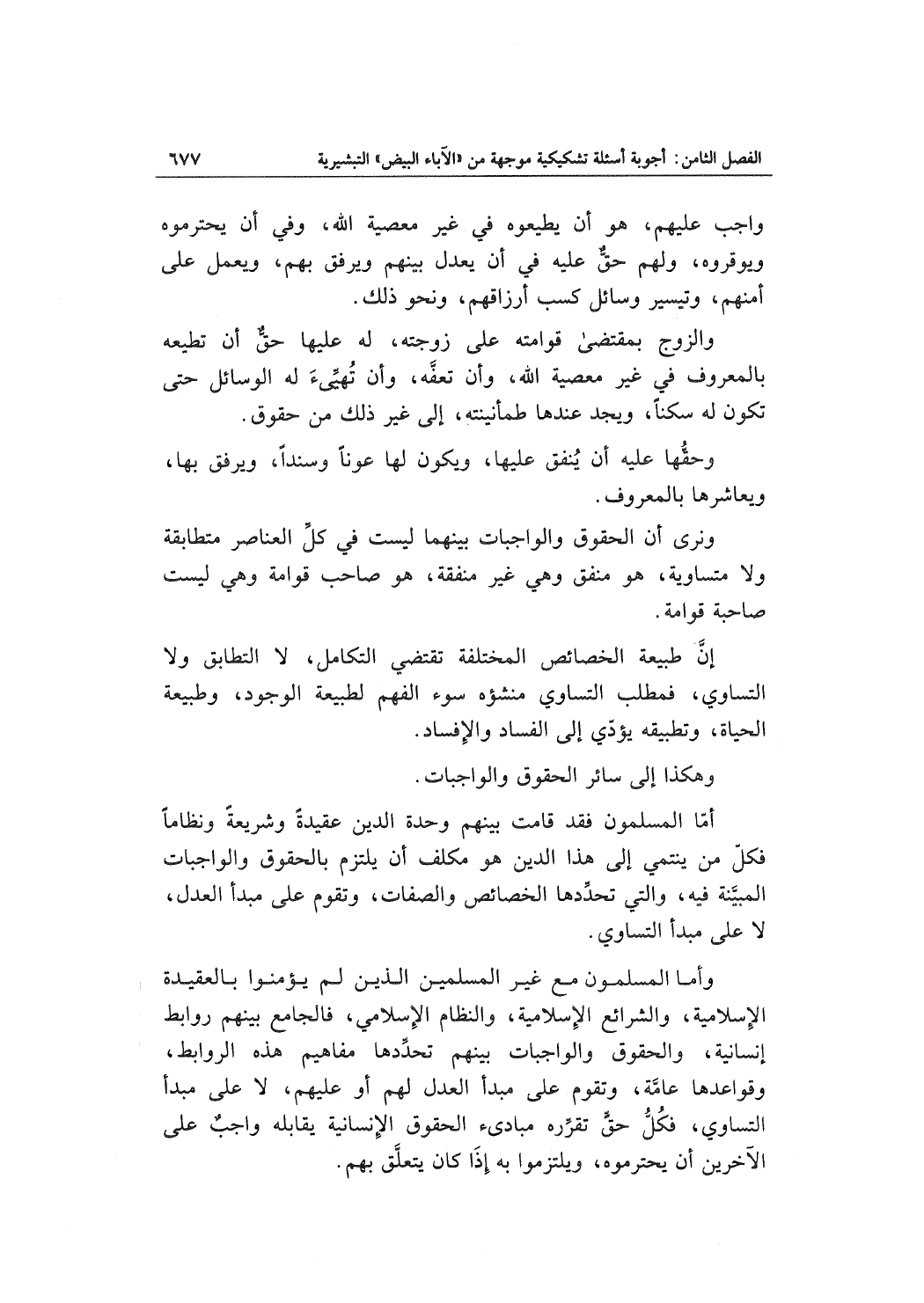 ونرى أن الحقوق والواجبات بينهما ليست في كل العناصر متطابقة ولا متساوية، هو منفق وهي غير منفقة، هو صاحب قوامة وهي ليست صاحبة قوامة.