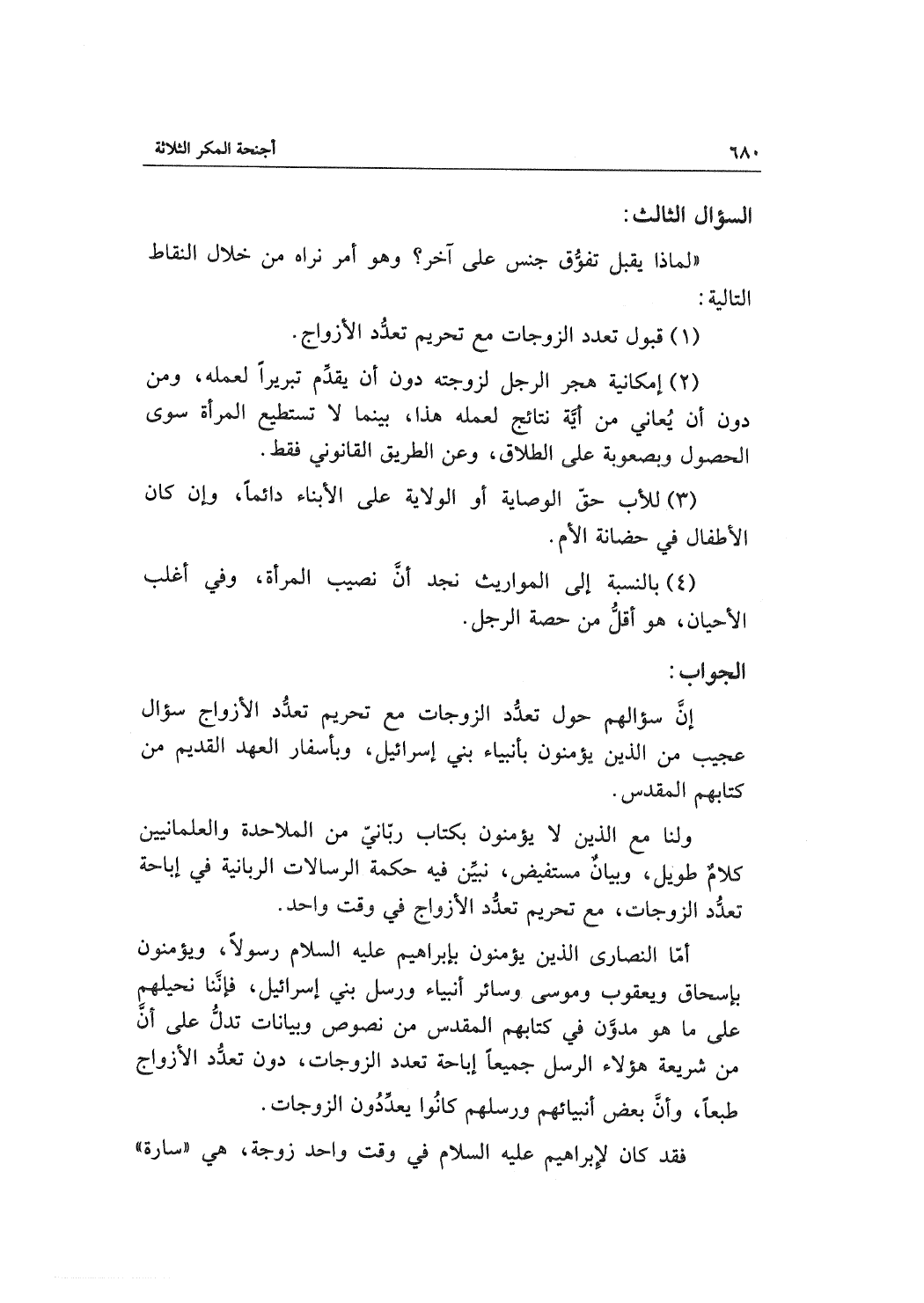 إن سؤالهم حول تعدد الزوجات مع تحريم تعدد الأزواج سؤال عجيب من الذين يؤمنون بأنبياء بني إسرائيل، وبأسفار العهد القديم من كتابهم المقدس.
