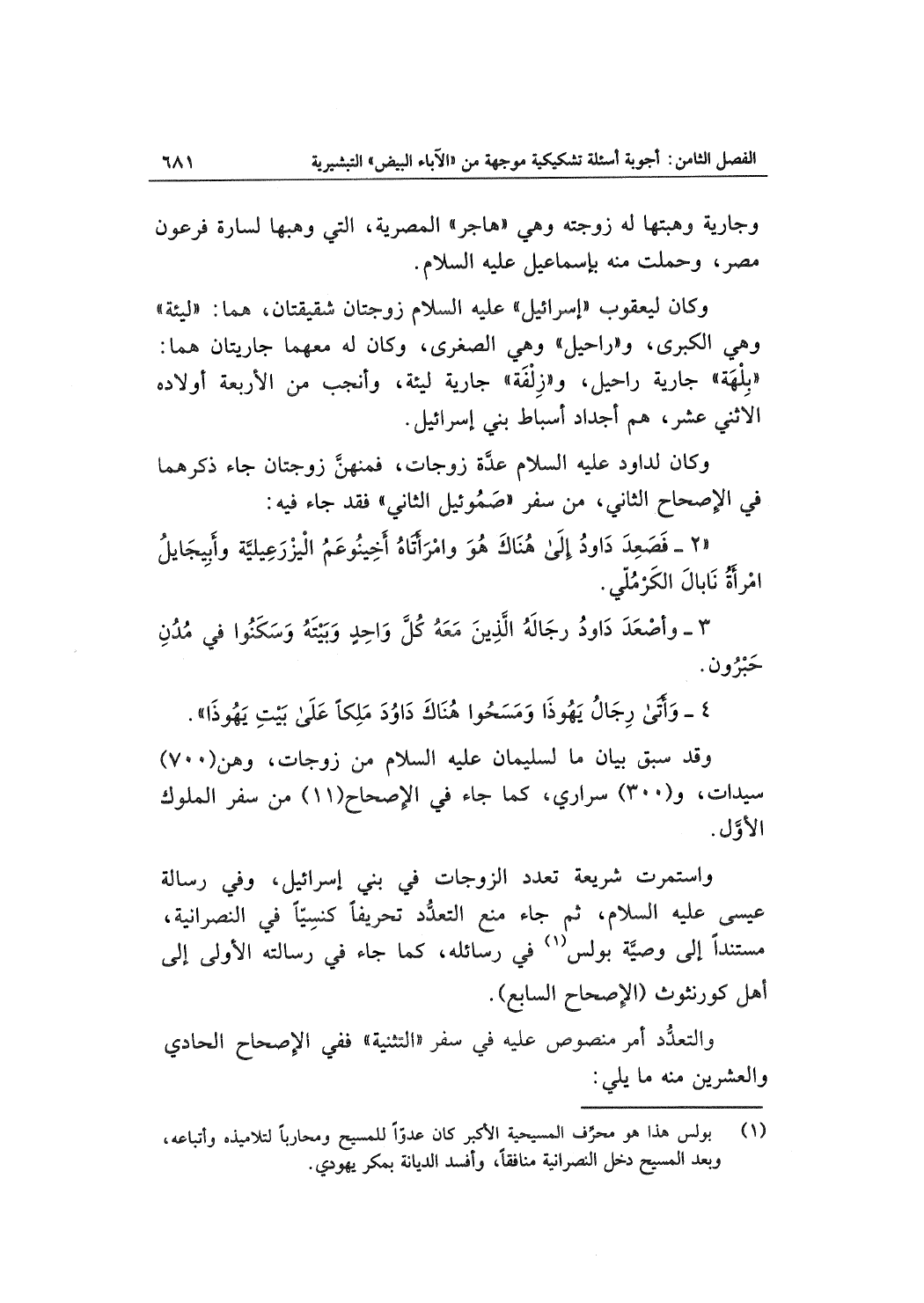 واستمرت شريعة تعدد الزوجات في بني إسرائيل، وفي رسالة عيسى عليه السلام، ثم جاء منع التعدد تحريفاً كنسياً في النصرانية، مستنداً إلى وصية بولس في رسائله، كما جاء في رسالته الأولى إلى أهل كورنثوث (الإصحاح السابع) .