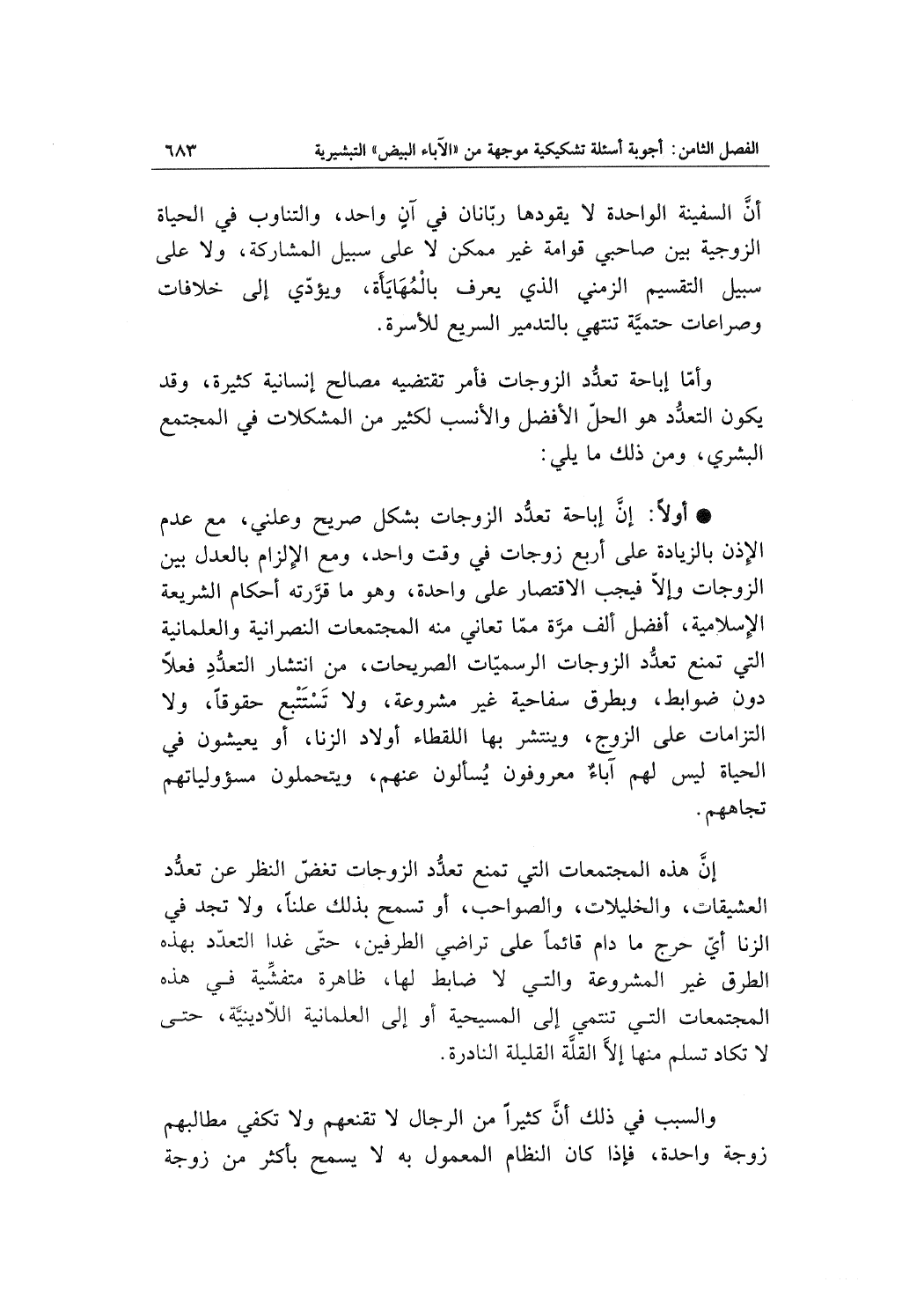 * أولاً: إن إباحة تعدد الزوجات بشكل صريح وعلني، مع عدم الإذن بالزيادة على أربع زوجات في وقت واحد، ومع الإلزام بالعدل بين الزوجات وإلا فيجب الاقتصار على واحدة، وهو ما قررته أحكام الشريعة الإسلامية، أفضل ألف مرة مما تعاني منه المجتمعات النصرانية والعلمانية التي تمنع تعدد الزوجات الرسمية الصريحات، من انتشار التعدد فعلاً دون ضوابط، وبطرق سفاحية غير مشروعة، ولا تستتبع حقوقاً، ولا التزامات على الزوج، وينتشر بها اللقطاء أولاد الزنا، أو يعيشون في الحياة ليس لهم آباءٌ معروفون يُسألون عنهم، ويتحملون مسؤولياتهم تجاههم.