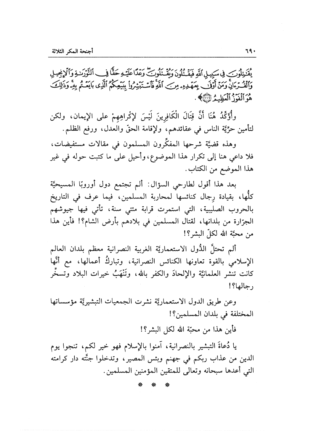 وأؤكد هنا أن قتال الكافرين ليس لإكراههم على الإيمان، ولكن لتأمين حرِّيَّة الناس في عقائدهم، ولإقامة الحق والعدل، ورفع الظلم.