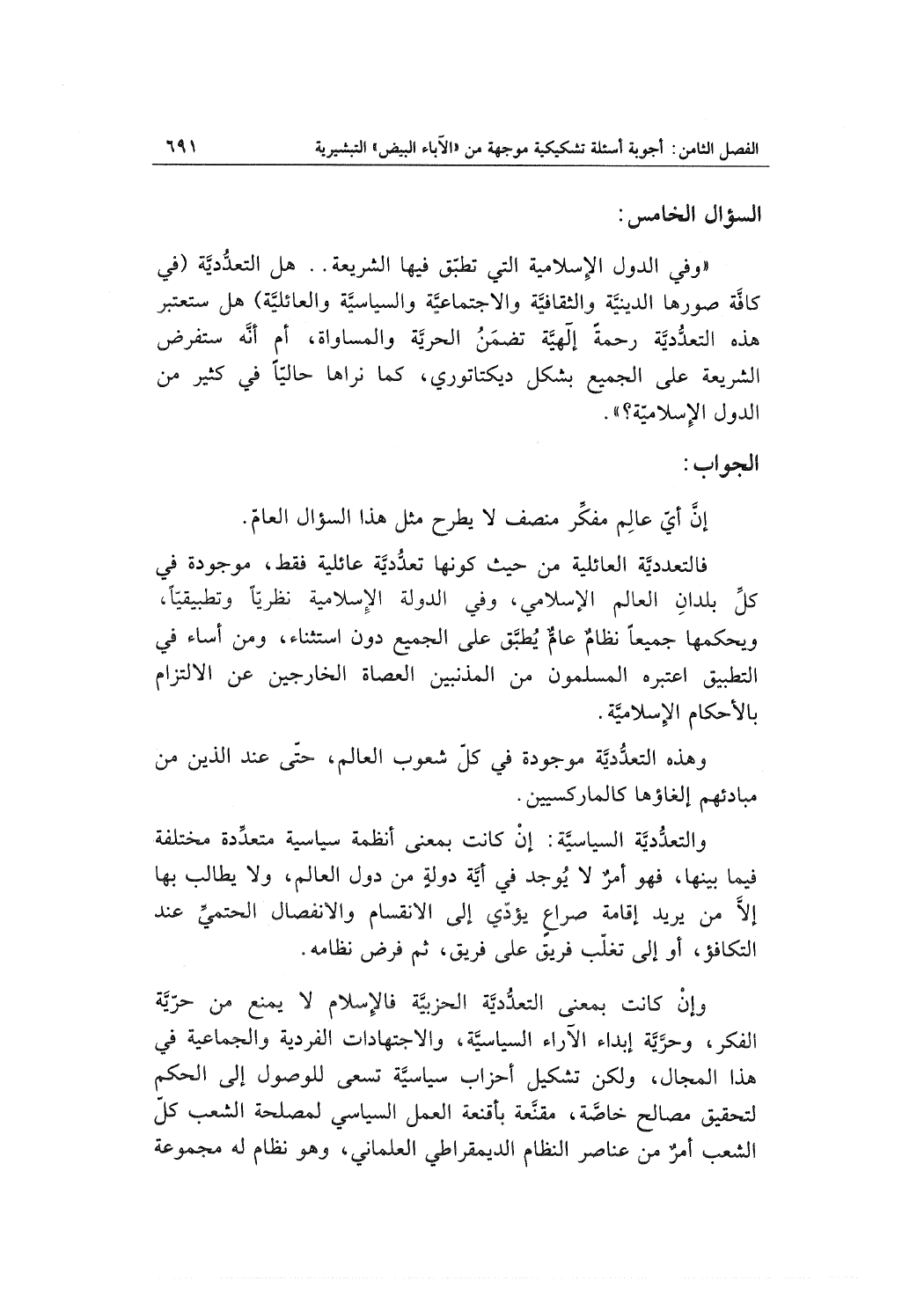 "وفي الدول الإسلامية التي تطبّق فيها الشريعة.. هل التعددية (في كافة صورها الدينية والثقافية والاجتماعية والسياسية والعائلية) هل ستعتبر هذه التعددية رحمة إلهية تضمن الحرِّيَّة والمساواة، أم أنه ستفرض الشريعة على الجميع بشكل ديكتاتوري، كما نراها حالياً في كثير من الدول الإسلامية؟ ".