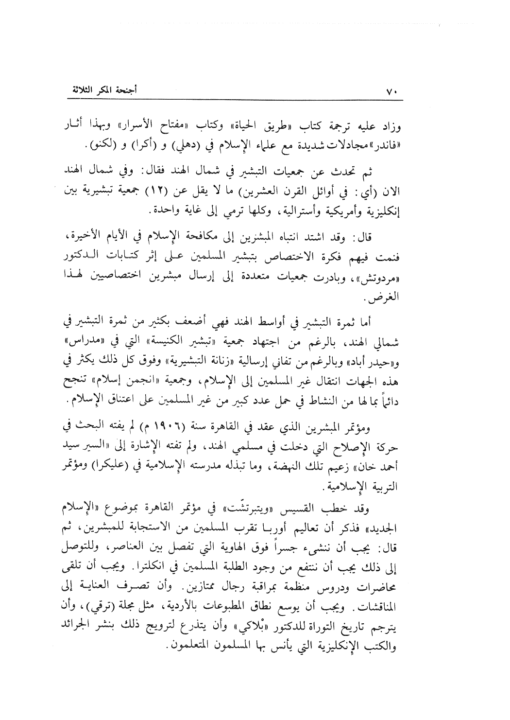 وقد خطب القسيس "ويتبرتشّت" في مؤتمر القاهرة بموضوع "الإسلام الجديد" فذكر أن تعاليم أوربا تقرب المسلمين من الاستجابة للمبشرين، ثم قال: يجب أن ننشئ جسراً فوق الهاوية التي تفصل بين العناصر، ولتتوصل إلى ذلك يجب أن ننتفع من وجو الطلبة المسلمين في انكلترا. ويجب أن تلقى محاضرات ودروس منظمة بمراقبة رجال ممتازين. وأن تصرف العناية إلى المناقشات. ويجب أن يوسع نطاق المطبوعات بالأردية، مثل مجلة (ترقي) ، وأن يترجم تاريخ التوراة للدكتور "بلاكي" وأن يتذرع لترويج ذلك بنشر الجرائد والكتب الإنكليزية التي يأنس بها المسلمون المتعلمون.