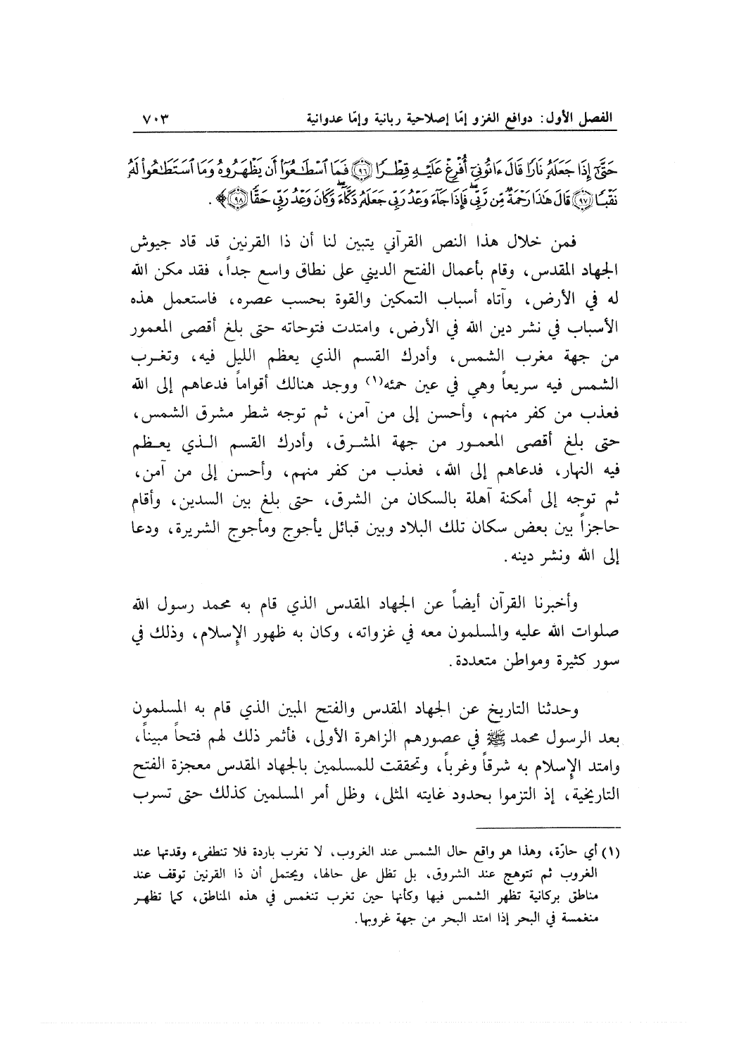فمن خلال هذا النص القرآني يتبين لنا أن ذا القرنين قد قاد جيوش الجهاد المقدس، وقام بأعمال الفتح الديني على نطاق واسع جداً، فقد مكن الله له في الأرض، وآتاه أسباب التمكين والقوة بحسب عصره، فاستعمل هذه الأسباب في نشر دين الله في الأرض، وامتدت فتوحاته حتى بلغ أقصى المعمور من جهة مغرب الشمس، وأدرك القسم الذي يعظم الليل فيه، وتغرب الشمس فيه سريعاً وهي في عين حمئه ووجد هنالك أقواماً فدعاهم إلى الله فعذب من كفر منهم، وأحسن إلى من آمن، ثم توجه شطر مشرق الشمس، حتى بلغ أقصى المعمور من جهة المشرق، وأدرك القسم الذي يعظم فيه النهار، فدعاهم إلى الله، فعذب من كفر منهم، وأحسن إلى من آمن، ثم توجه إلى أمكنة آهلة بالسكان من الشرق، حتى بلغ بين السدين، وأقام حاجزاً بين بعض سكان تلك البلاد وبين قبائل يأجوج ومأجوج الشريرة، ودعا إلى الله ونشر دينه.