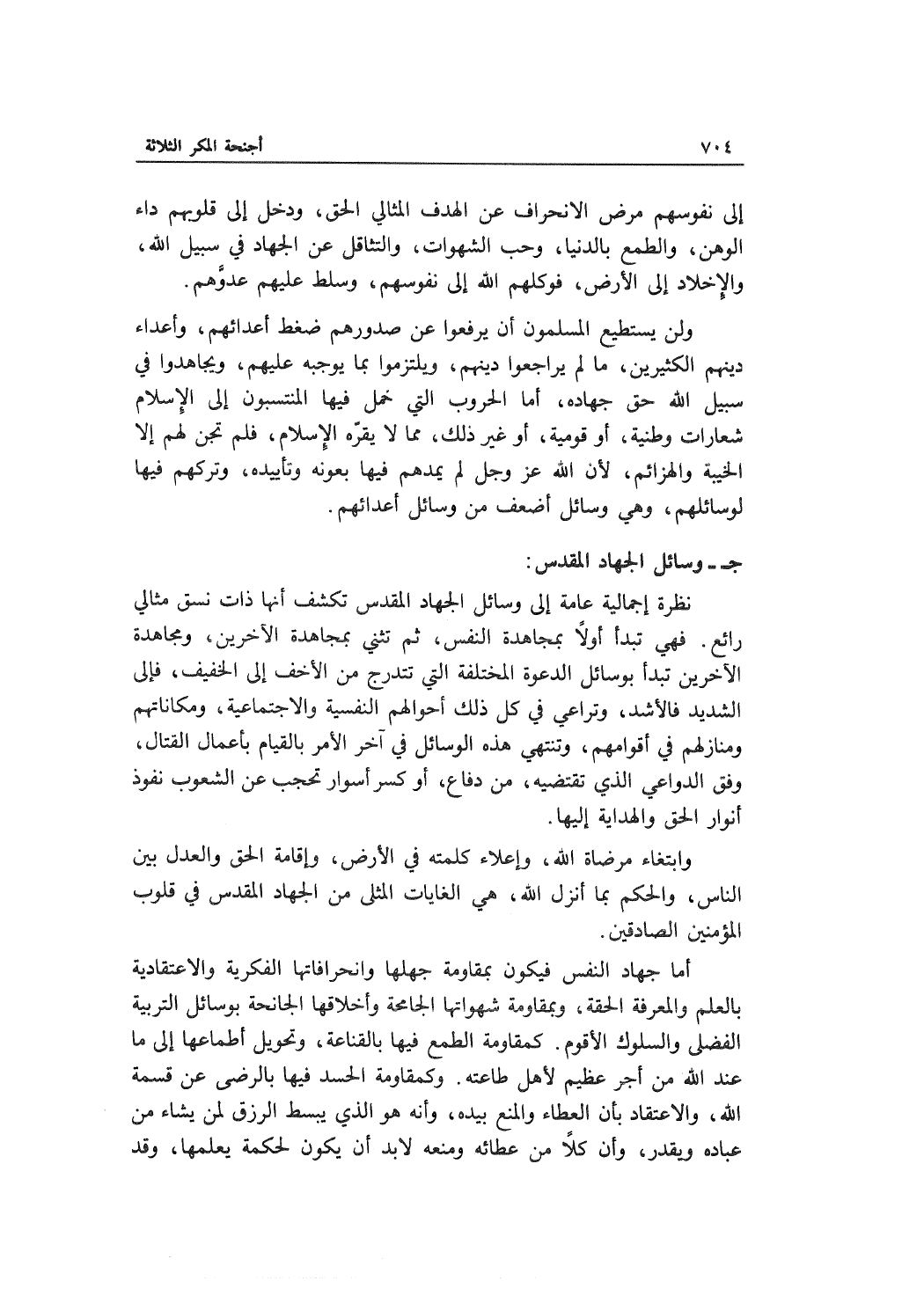 ولن يستطيع المسلمون أن يرفعوا عن صدورهم ضغط أعدائهم، وأعداء دينهم الكثيرون، ما لم يراجعوا دينهم، ويلتزموا بما يوجبه عليهم، ويجاهدوا في سبيل الله حق جهاده، أما الحروب التي خمل فيها المنتسبون إلى الإسلام شعارات وطنية أو قومية أو غير ذلك مما لا يقره الإسلام، فلم تجن لهم إلا الخيبة والهزائم، لأن الله عزَّ وجلَّ لم يمدهم فيها بعونه وتأييده، وتركهم فيها لوسائلهم، وهي وسائل أضعف من وسائل أعدائهم.