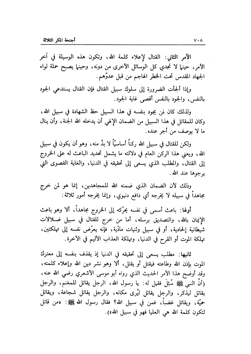ثانيها: مطلب يسعى إلى تحقيقه في الدنيا إذ يقذفه بنفسه إلى معترك الموت بإذن الله وطاعته فيقتل أو يقتل، ألا وهو نشر دين الله وإعلاء كلمته، وقد أوضح هذا الأمر الحديث الذي رواه أبو موسى الأشعري رضي الله عنه، (أنَّ النبي سئل فقيل له: يا رسول الله، الرجل يقاتل للمغنم والرجل يقاتل ليذكر والرجل يقاتل ليرى مكانه والرجل يقاتل شجاعة ويقاتل حمية ويقاتل غضباً فمن في سبيل الله؟ فقال رسول الله: "من قاتل لتكون كلمة الله هي العليا فهو في سبيل الله") .