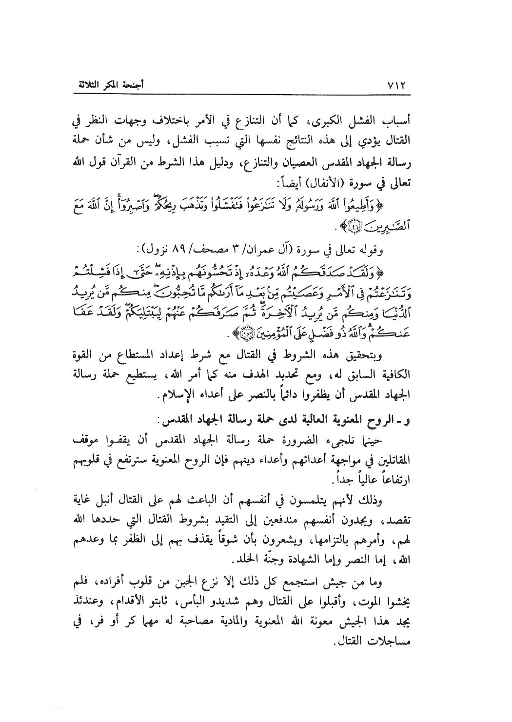 أسباب الفشل الكبرى، كما أن التنازع في الأمر باختلاف وجهات النظر في القتال يؤدي إلى هذه النتائج نفسها التي تسبب الفشل، وليس من شأن حملة رسالة الجهاد المقدس العصيان والتنازع، ودليل هذا الشرط من القرآن قول الله تعالى في سورة (الأنفال) أيضاً: