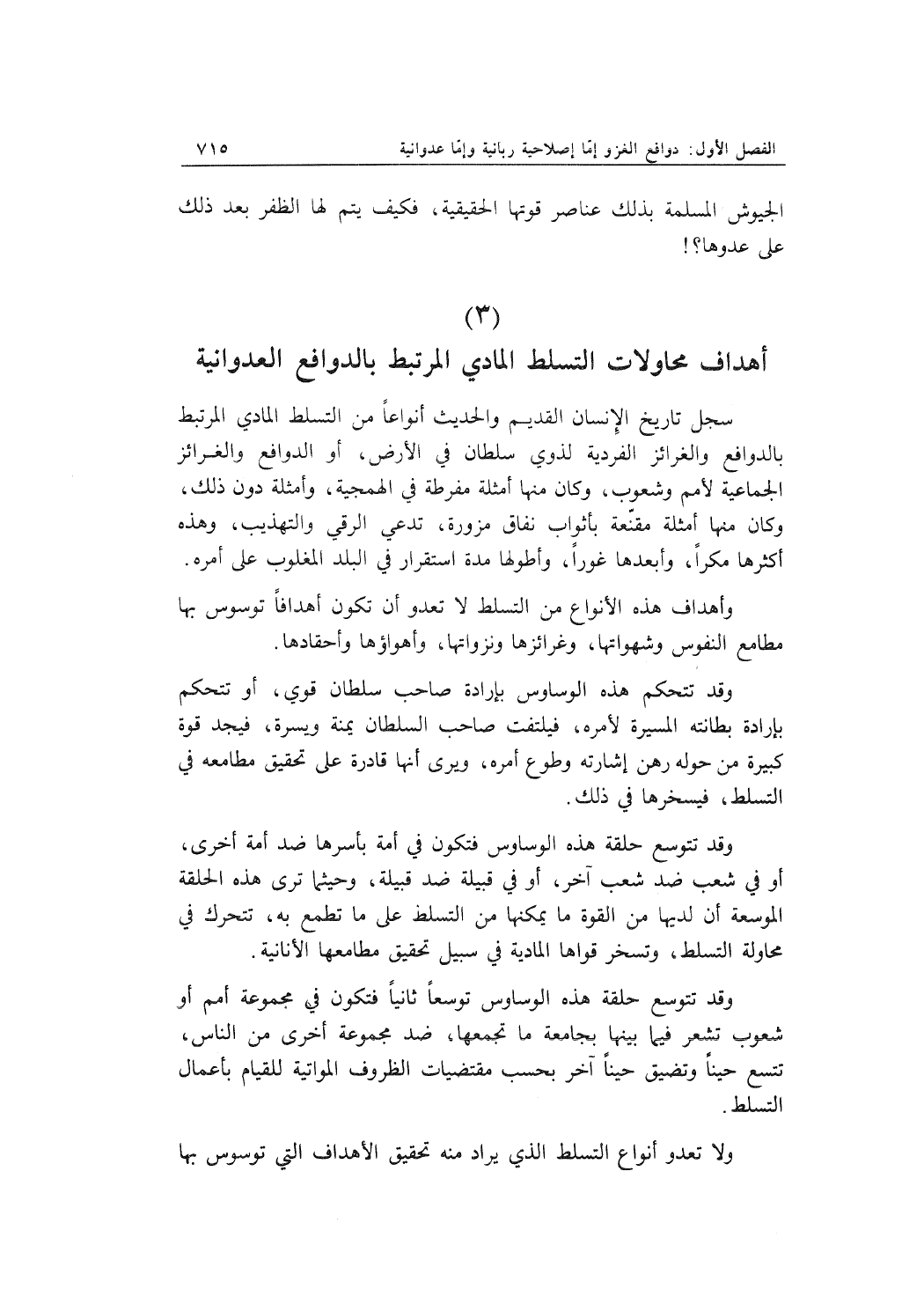 وقد تتوسع حلقة هذه الوساوس فتكون في أمة بأسرها ضد أمة أخرى، أو في شعب ضد شعب آخر، أو في قبيلة ضد قبيلة، وحيثما ترى هذه الحلقة الموسعة أن لديها من القوة ما يمكنها من التسلط على ما تطمع به، تتحرك في محاولة التسلط، وتسخر قواها المادية في سبيل تحقيق مطامعها الأنانية.