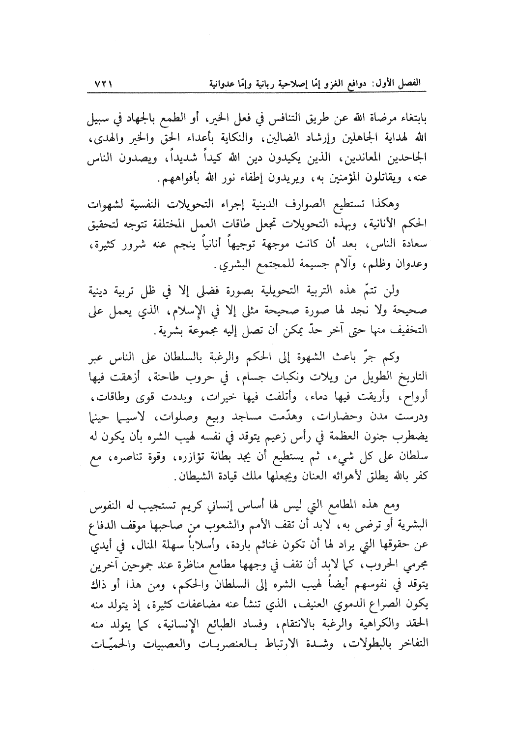 ومع هذه المطامع التي ليس لها أساس إنساني كريم تستجيب له النفوس البشرية أو ترضى به، لا بد أن تقف الأمم والشعوب من صاحبها موقف الدفاع عن حقوقها التي يراد لها أن تكون غنائم باردة، وأسلاباً سهلة المنال، في أيدي مجرمي الحروب، كما لا بد أ، تقف في وجهها مطامع مناظرة عند جموحين آخرين يتوقد في نفوسهم أيضاً لهيب الشره إلى السلطان والحكم، ومن هذا أو ذاك يكون الصراع الدموي العنيف، الذي تنشأ عنه مضاعفات كثيرة، إذ يتولد منه الحقد والكراهية والرغبة بالانتقام، وفساد الطبائع الإنسانية، كما يتولد منه التفاخر بالبطولات، وشدة الارتباط بالعنصريات والعصبيات والحميّات