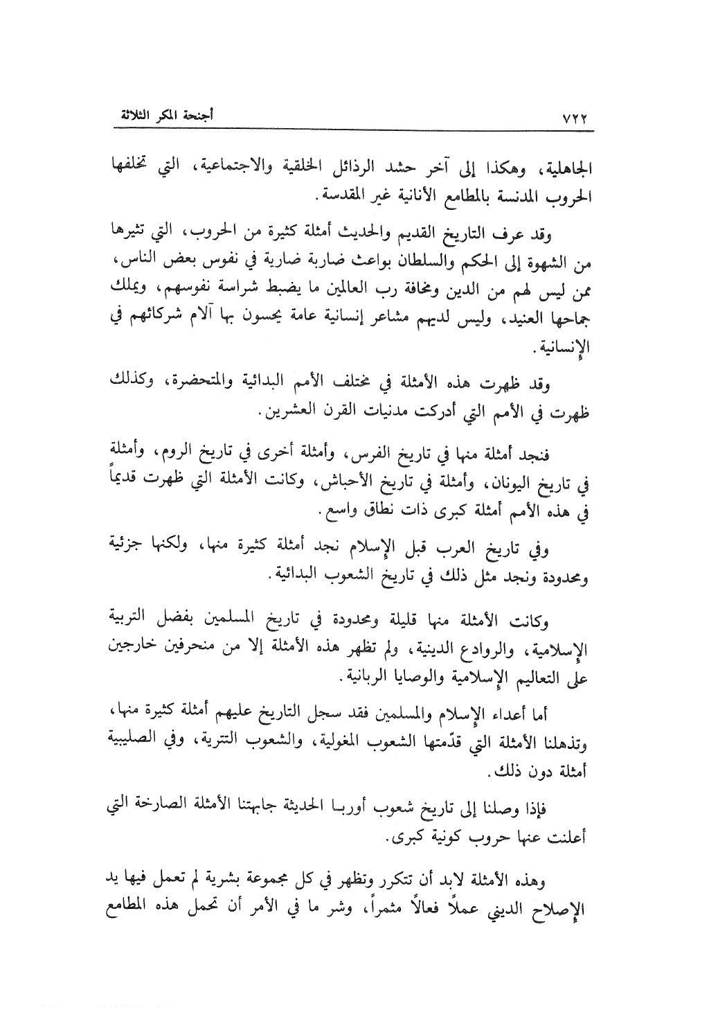 الجاهلية، وهكذا إلى آخر حشد الرذائل الخلقية والاجتماعية، التي تخلفها الحروب المدنسة بالمطامع الأنانية غير المقدسة.