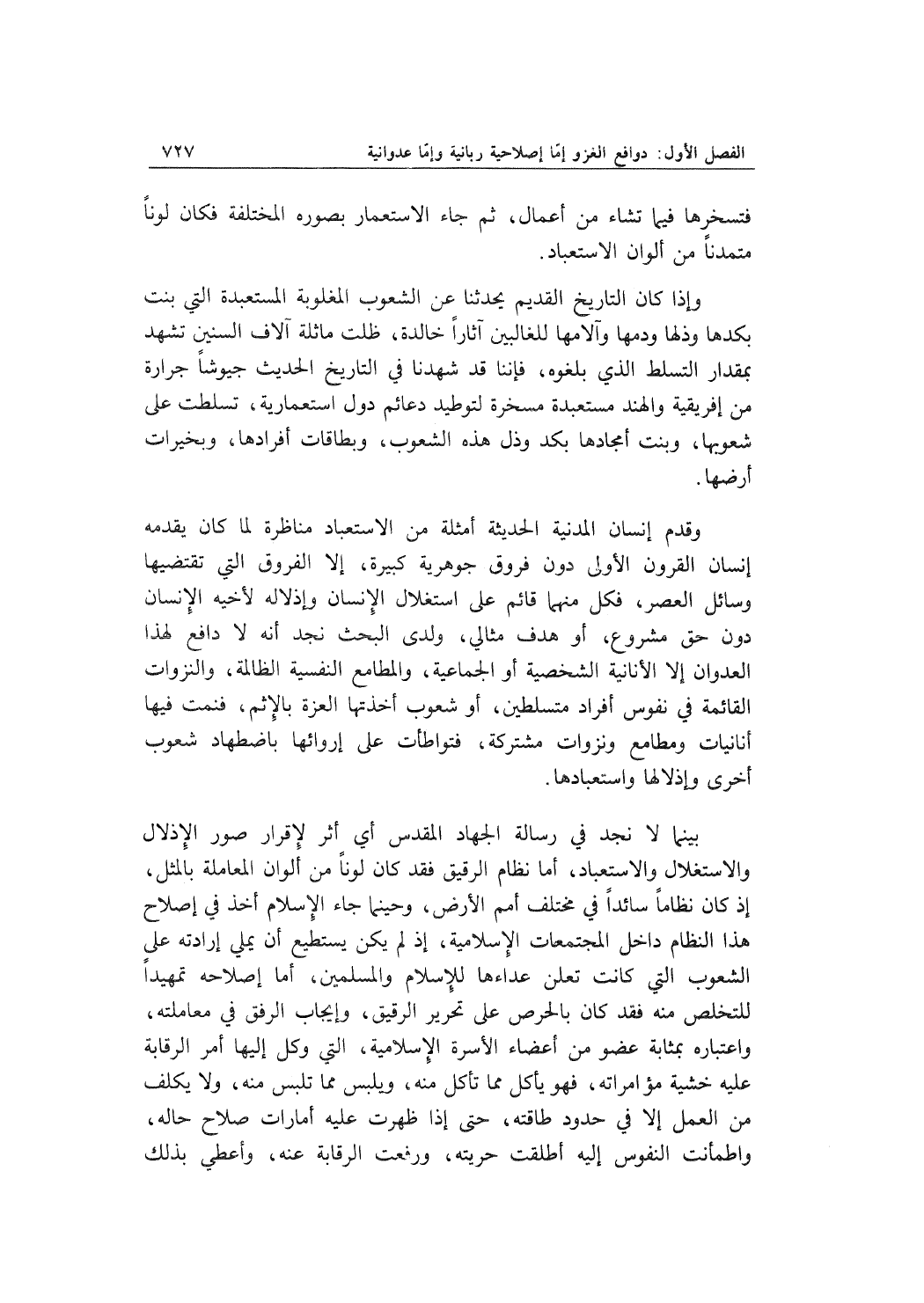 فتسخرها فيما تشاء من أعمال، ثم جاء الاستعمار بصوره المختلفة فكان لوناً متمدناً من ألوان الاستعباد.