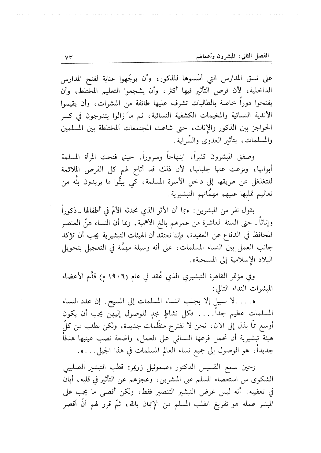 ".... لا سبيل إلا بجلب النساء المسلمات إلى المسيح. إن عدد النساء المسلمات عظيم جداً.... فكل نشاطٍ مجدٍ للوصول إليهن يجب أن يكون أوسع مما بذل إلى الآن، نحن لا نقترح منظّمات جديدة، ولكن نطلب من كلّ هيئة تبشيرية أن تحمل فرعها النسائي على العمل واضعة نصب عينيها هدفاً جديداً، هو الوصول إلى جميع نساء العالم المسلمات في هذا الجيل..".