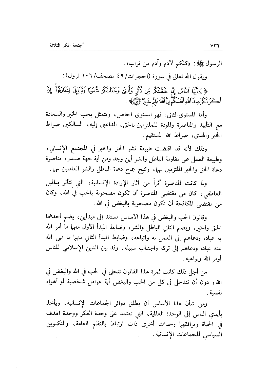 ولما كانت المناصرة أثراً من آثار الإرادة الإنسانية، التي تتأثر بالميل العاطفي، كان من مقتضى النصرة أن تكون مصحوبة بالحب في الله، وكان من مقتضى المكافحة أن تكون مصحوبة بالبغض في الله.
