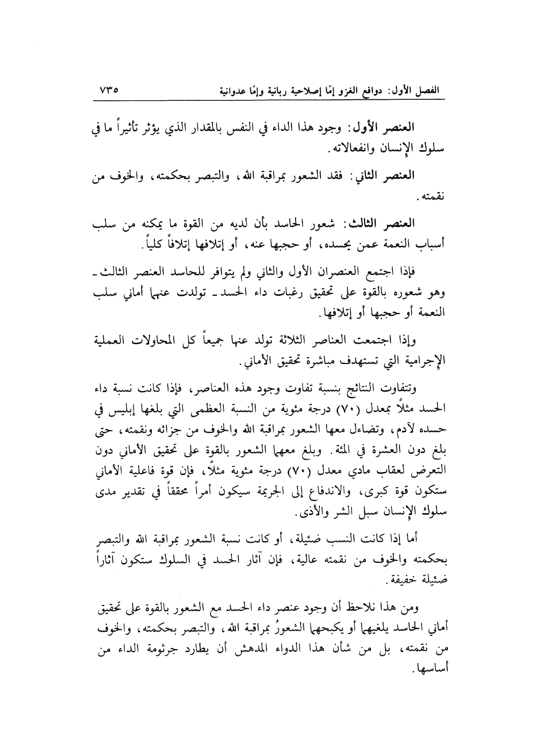 ومن هذا نلاحظ أن وجود عنصر داء الحسد مع الشعور بالقوة على تحقيق أماني الحاسد يلغيهما أو يكبحهما الشعورُ بمراقبة الله، والتبصر بحكمته، والخوف من نقمته، بل من شأن هذا الدواء المدهش أن يطارد جرثومة الداء من أساسها.