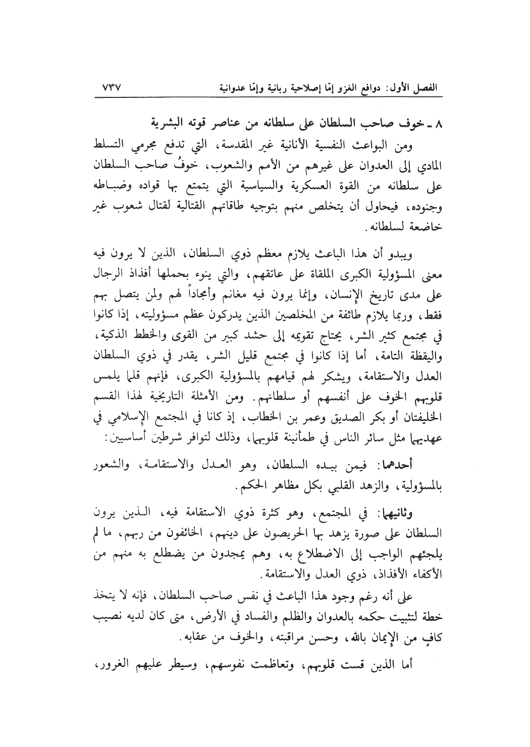 وثانيهما: في المجتمع،وهو كثرة ذوي الاستقامة فيه، الذين يرون السلطان على صورة يزهد بها الحريصون على دينهم، الخائفون من ربهم، ما لم يلجئهم الواجب إلى الاضطلاع به، وهم يمجدون من يضطلع به منه من الأكفاء الأفذاذ، ذوي العدل والاستقامة.
