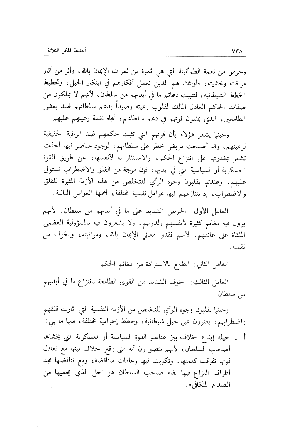وحرموا من نعمة الطمأنينة التي هي ثمرة من ثمرات الإيمان بالله، وأثر من آثار مراقبته وخشيته. فأولئك هم الذين تعمل أفكارهم في ابتكار الحيل وتخطيط الخطط الشيطانية لتثبيت دعائم ما في أيديهم من سلطان، لأنهم لا يملكون من صفات الحاكم العادل المالك لقلوب رعيته رصيداً يدعم سلطانهم ضد بعض الطامعين الذين يمثلون قوتهم في عدم سلطانهم تجاه نقمة رعيتهم عليهم.