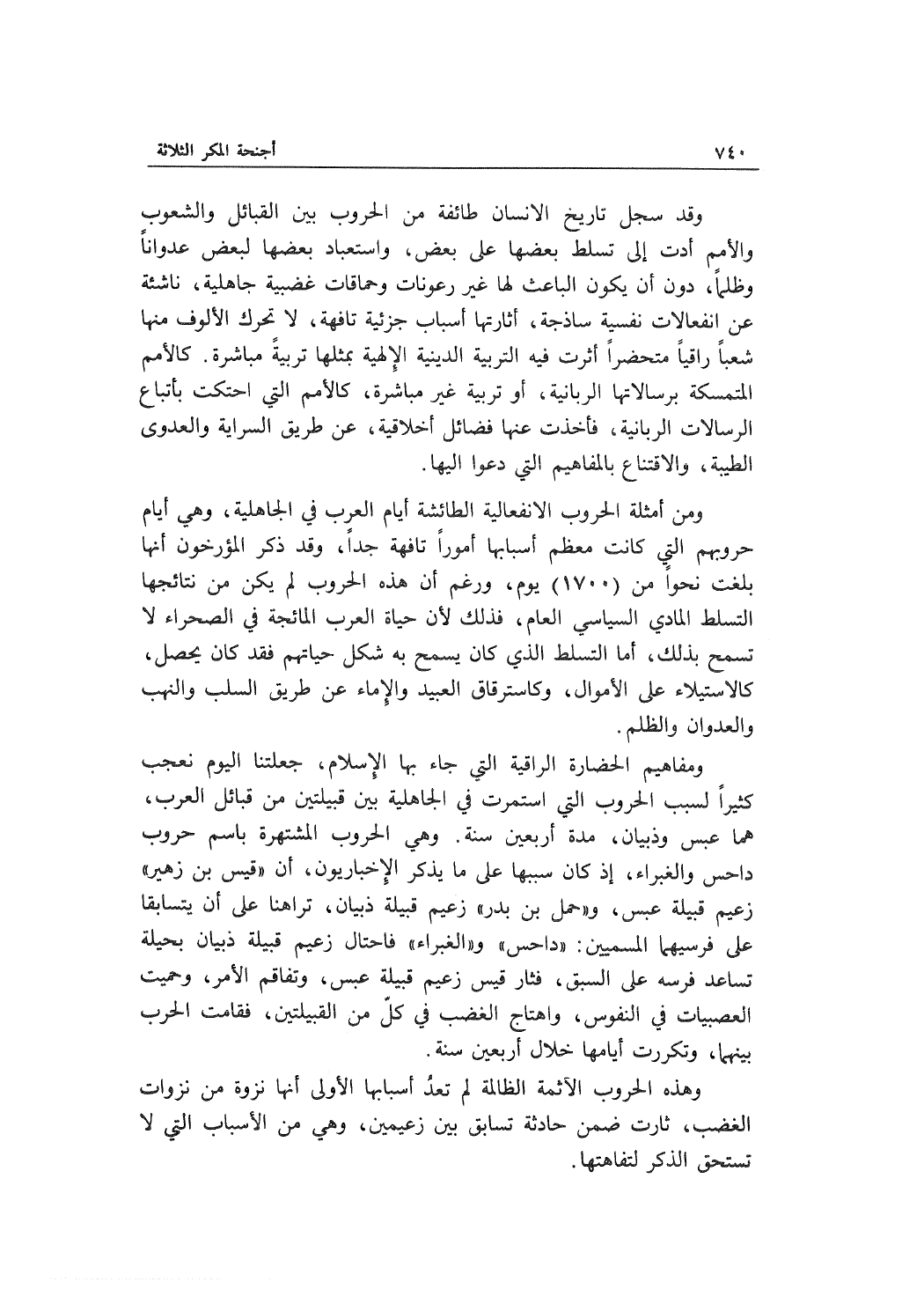 وقد سجل تاريخ الإنسان طائفة من الحروب بين القبائل والشعوب والأمم أدت إلى تسلط بعضها على بعض، واستعباد بعضها لبعض عدواناً وظلماً دون أن يكون الباعث لها غير رعونات وحماقات غضبية جاهلية، ناشئة عن افنعالات نفسية ساذجة، أثارتها أسباب جزئية تافهة، لا تحرك الألوف منها شعباً راقياً متحضراً أثرت فيه التربية الدينية الإلهية بمثلها تربيةً مباشرة. كالأمم المتمسكة برسالاتها الربانية، أو تربية غير مباشرة كالأمم التي احتكت بأتباع الرسالات الربانية. فأخذت عنها فضائل أخلاقية عن طريق السراية والعدوى الطيبة والاقتناع بالمفاهيم التي دعوا إليها.