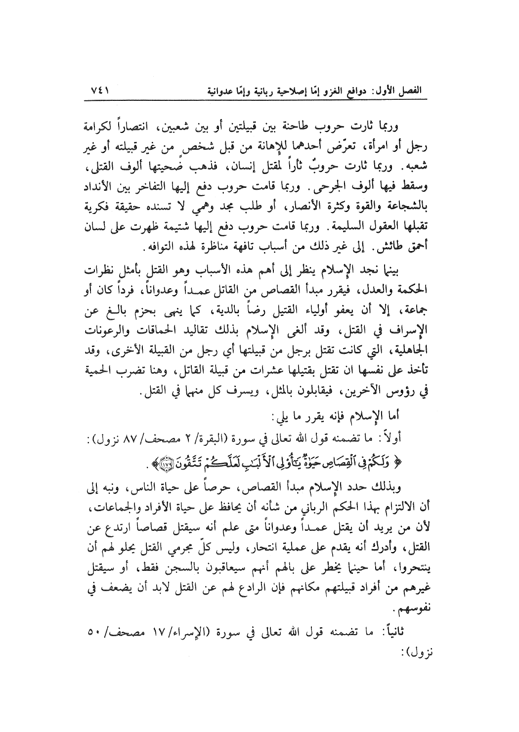 بينما نجد الإسلام ينظر إلى أهم هذه الأسباب وهو القتل بأمثل نظرات الحكمة والعدل، فيقرر مبدأ القصاص من القاتل عمداً وعدواناً، فرداً كان أو جماعة، إلا أن يعفو أولياء القتيل رضاً بالدية، كما ينهى بحزم بالغ عن الإسراف في القتل، وقد ألغى الإسلام بذلك تقاليد الحماقات والرعونات الجاهلية، التي كانت تقتل برجل من قبيلتها أي رجل من القبيلة الأخرى، وقد تأخذ على نفسها أن تقتل بقتيلها عشرات من قبيلة القاتل، وهنا تضرب الحمية في رؤوس الآخرين، فيقابلون بالمثل، ويسرف كل منهما في القتل.