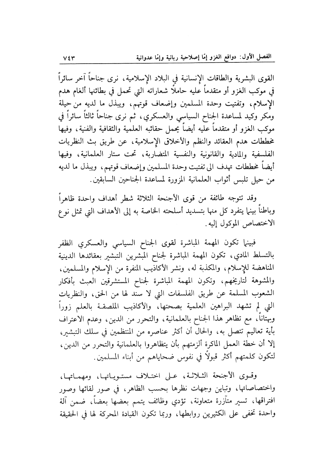 القوى البشرية والطاقات الإنسانية في البلاد الإسلامية نرى جناحاً آخر سائراً في موكب الغزو أو متقدماً عليه حاملاً شعاراته التي تحمل في بطائنها ألغام هدم الإسلام، وتفتيت وحدة المسلمين وإضعاف قوتهم ويبذل ما لديه من حيلة ومكر وكيد لمساعدة الجناح السياسي والعسكري. ثم نرى جناحاً ثالثاً سائراً في موكب الغزو أو متقدماً عليه أيضاً يحمل حقائبه العلمية والثقافية والفنية وفيها مخططات هدم العقائد والنظم والأخلاق الإسلامية عن طريق بث النظريات الفلسفية والمادية والقانونية والنفسية المتضاربة تحت ستار العلمانية. وفيها أيضاً مخططات تهدف إلى تفتي وحدة المسلمين وإضعاف قوتهم. ويبذل ما لديه من حيل تلبس أثواب العلمانية المزورة لمساعدة الجناحين السابقين.